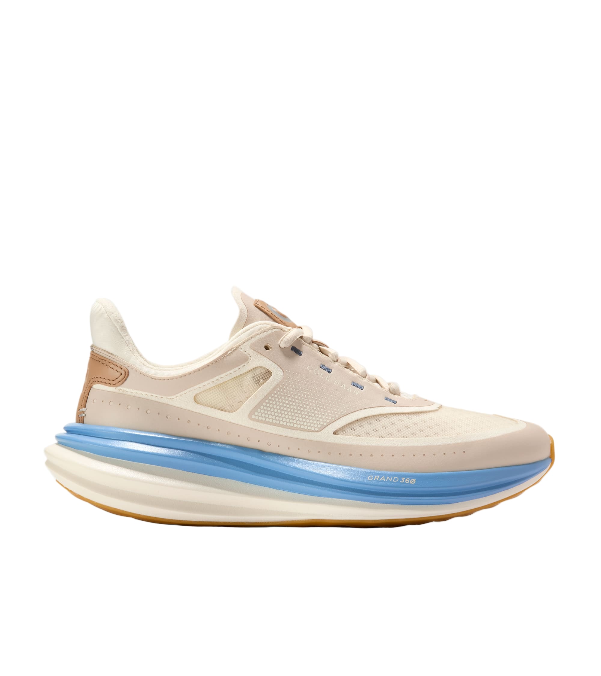 The Cole Haan Women's OriginalGrand Quadstar Running Sneakers showcase a stylish and functional design, featuring a sophisticated blend of TPU, polyester, and leather in a harmonious color palette of Light Sesame, Ivory, and Midnight Blue. Their five-loop lacing system ensures a secure and customizable fit, while the durable rubber outsole provides excellent traction and stability on various surfaces. The sneakers are equipped with a SuperFeel NRG Foam midsole, delivering exceptional cushioning and responsive support for all-day comfort. Combining modern materials with thoughtful construction, these sneakers offer both performance and style for the active woman.