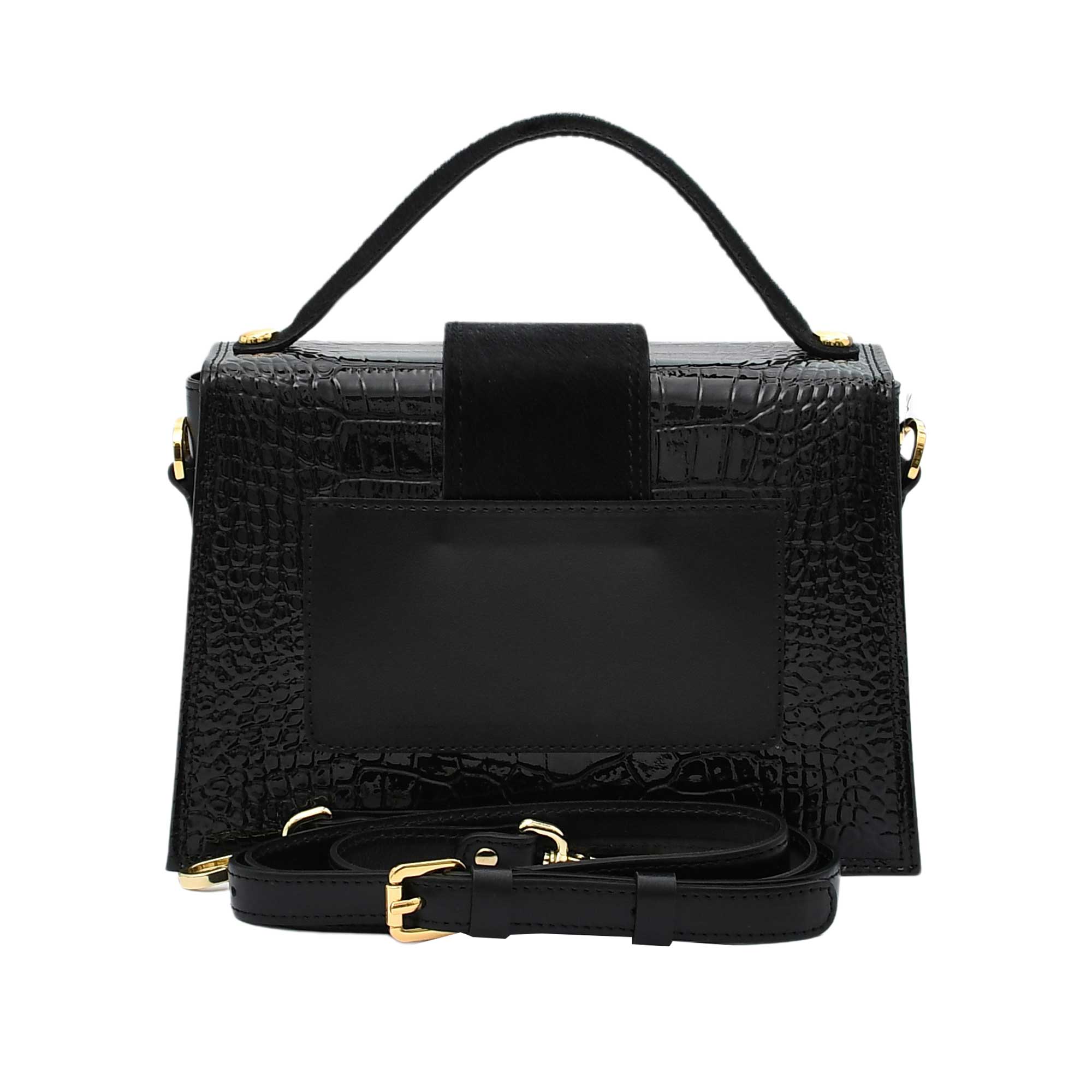 • Features a front flap secured by a prominent metallic clasp for added refinement