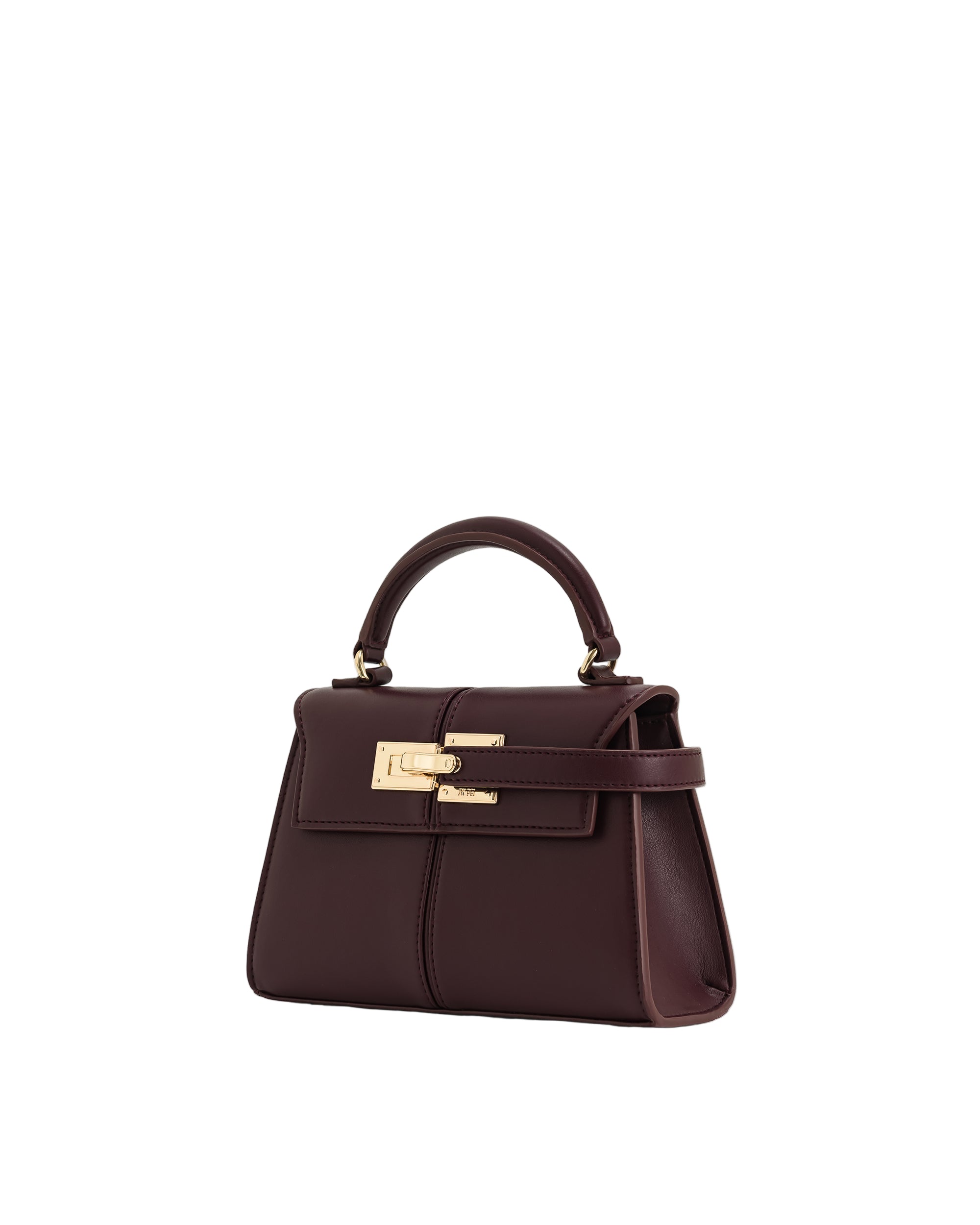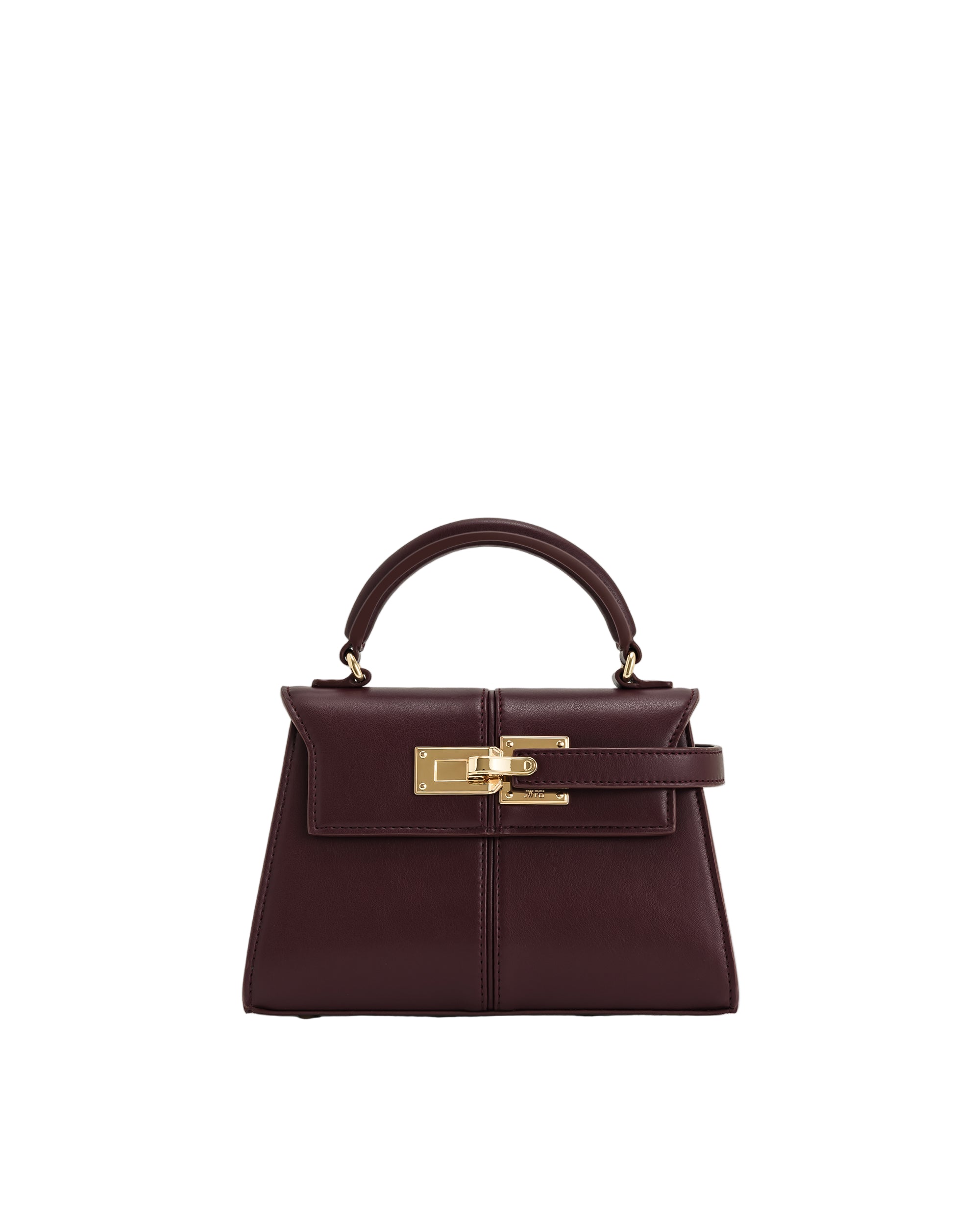 Featuring a rich burgundy hue and striking gold hardware, this top-handle piece is a sophisticated way to carry your essentials in a compact, timeless silhouette.