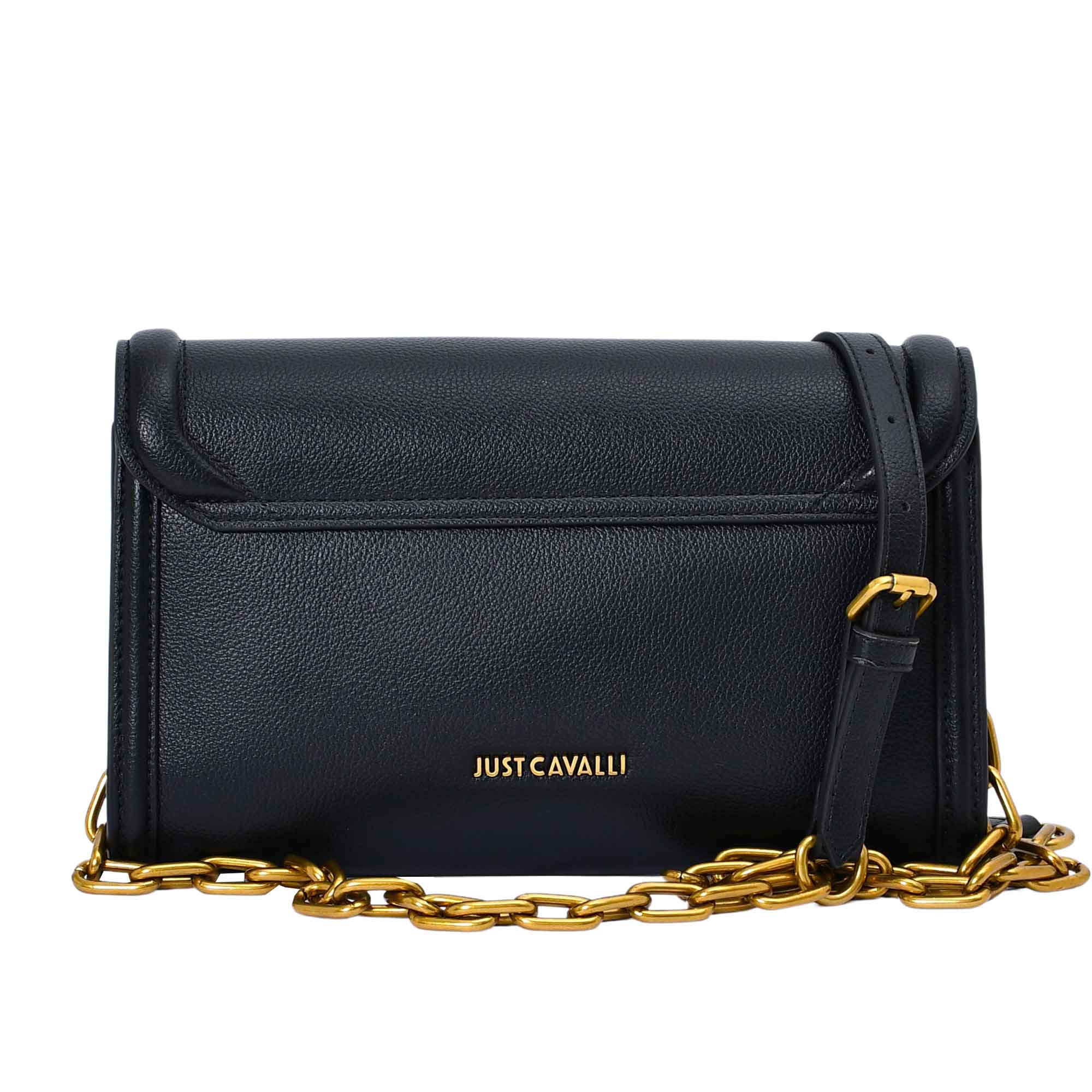 The Just Cavalli Women's Gold-Embellished Flap Shoulder Bag exudes elegance and sophistication with its striking hammered-effect finish and rectangular design. This chic accessory features a distinctive flap fastening that securely fits into a central loop adorned with a prominent metal JC Monogram, which is stylishly framed by four delicate straps, adding a touch of refined detail. The back of the bag is subtly enhanced with a sleek metal Just Cavalli logo, underscoring its designer pedigree. For comfort and convenience, the bag includes a chain strap with a cushioned shoulder pad, making it perfect for extended wear. Inside, it offers practical organization with an interior wall pocket equipped with a zipper, ensuring your essentials stay secure and easily accessible. This flap shoulder bag effortlessly blends functionality with high-fashion appeal, making it a must-have accessory for the modern woman.