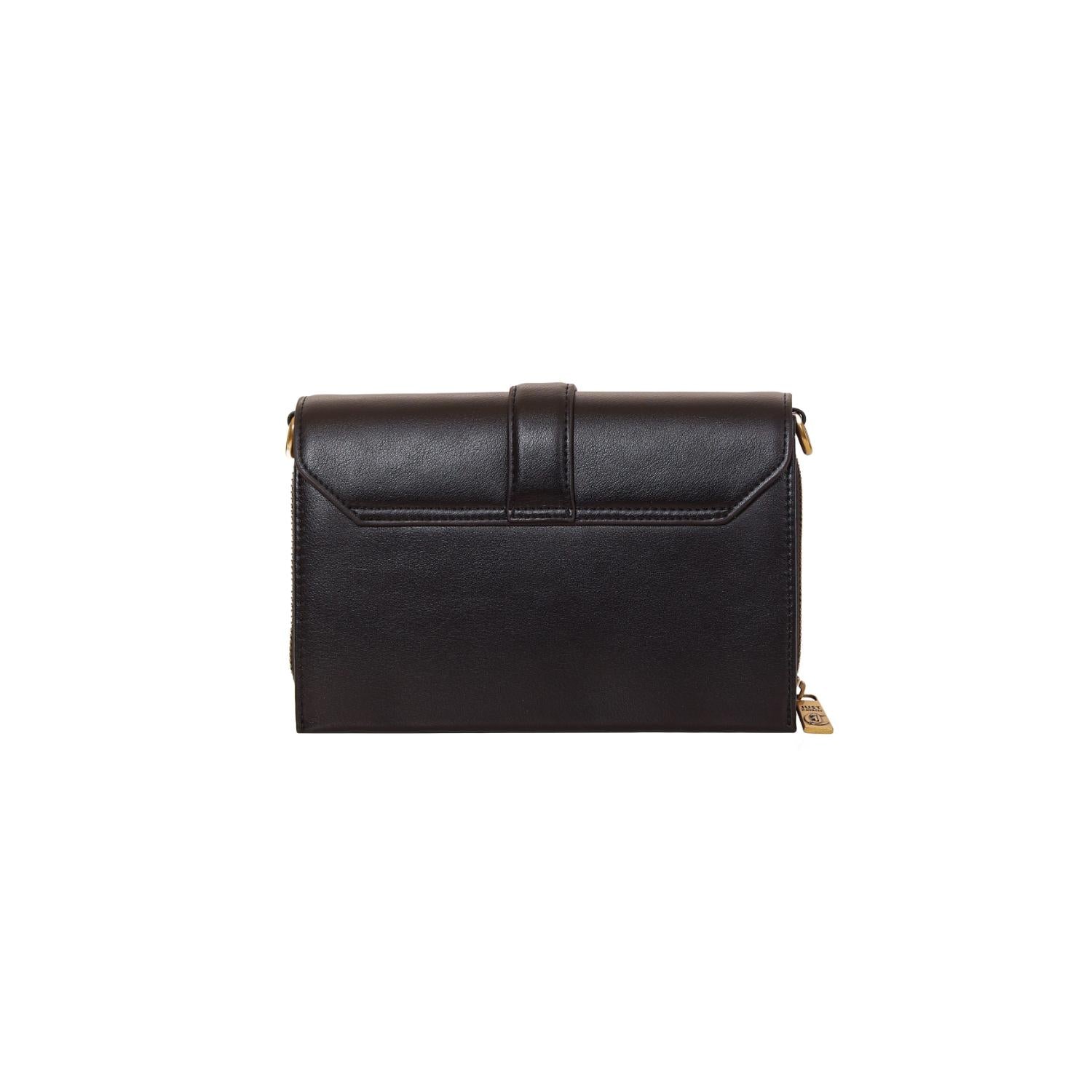 Design: A structured, rectangular shoulder bag with a fold-over flap closure secured by a central vertical strap.