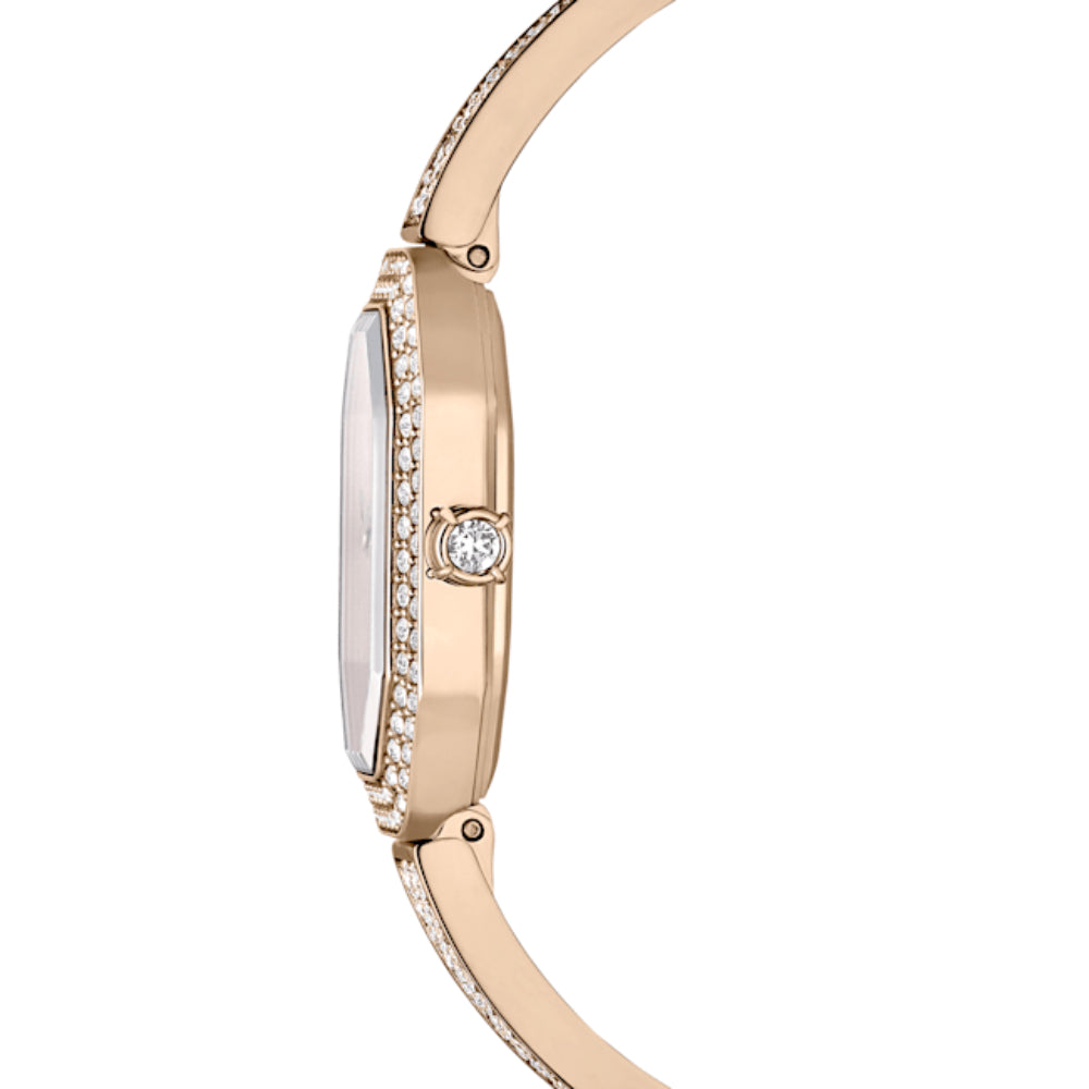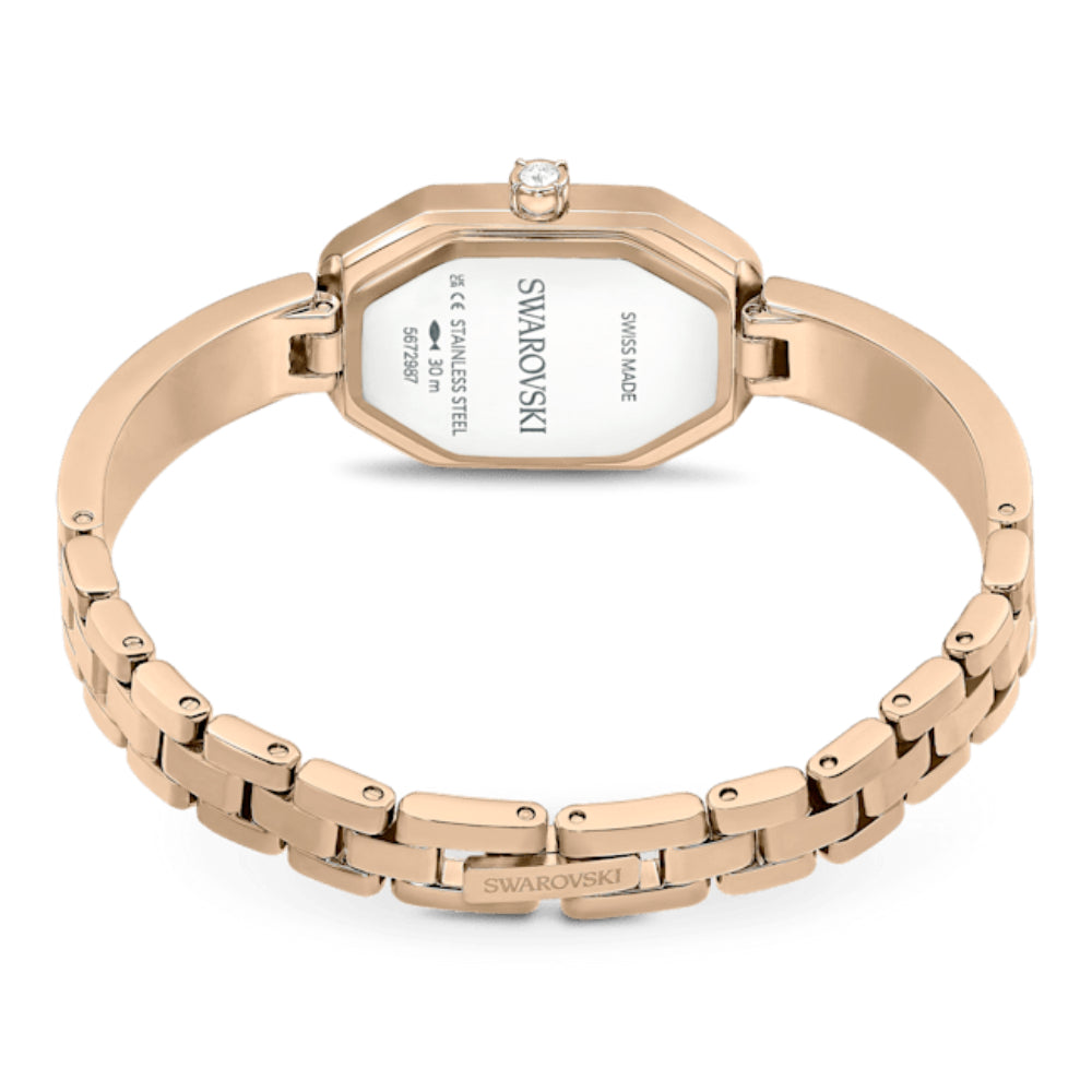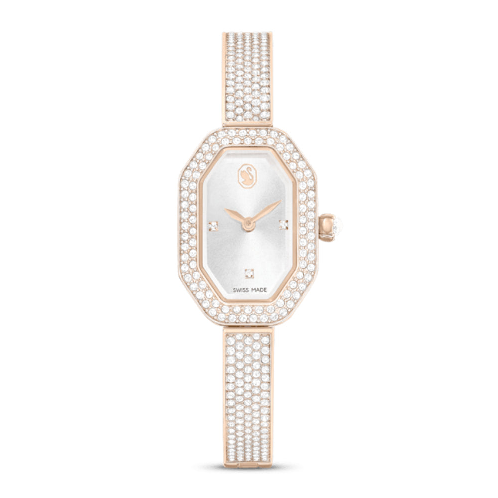 Swarovski Dextera Bangle Watch, Swiss Made Metal Bracelet This eye-catching Dextera bangle watch is designed in Swarovski's well-known distinctive octagon form. The 20mm x 30.5mm case has a rose gold finish and a pavé of 92 crystals on the bezel. This creates an ideal frame for the sunray dial, which has a swan symbol at 12 o'clock and three crystalline index markers. around with a single stunning crystal placed in the crown, the watch is also adorned with 194 crystals positioned around the flexible band, delivering remarkable elegance at all hours. This Swiss-made timepiece is water resistant up to 30 metres and mixes exuberant opulence with Swarovski's signature savoir-faire.