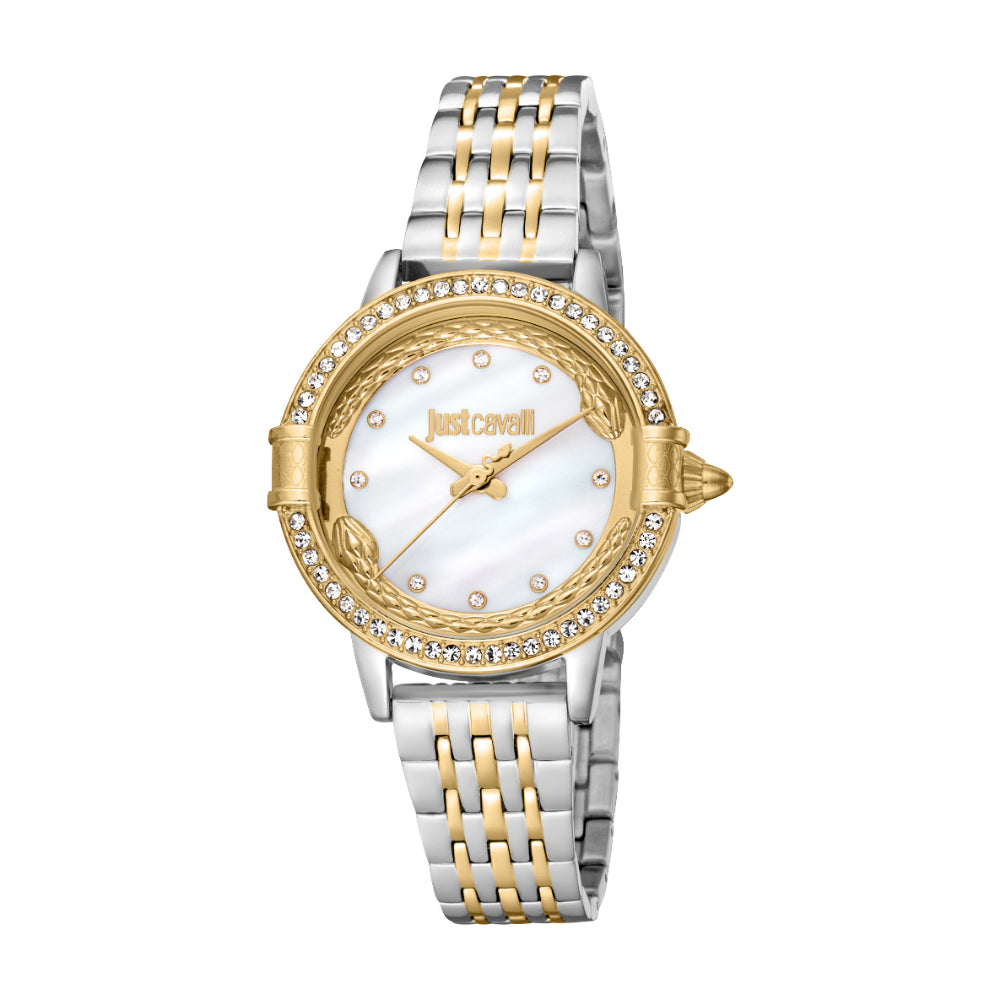 Elevate your look with this stylish Just Cavalli women's watch. The two-tone silver and gold color case and bracelet create a unique and modern look that complements the elegant white mother of pearl dial. This watch features three hands and is water-resistant up to 5 ATM, making it perfect for everyday wear.