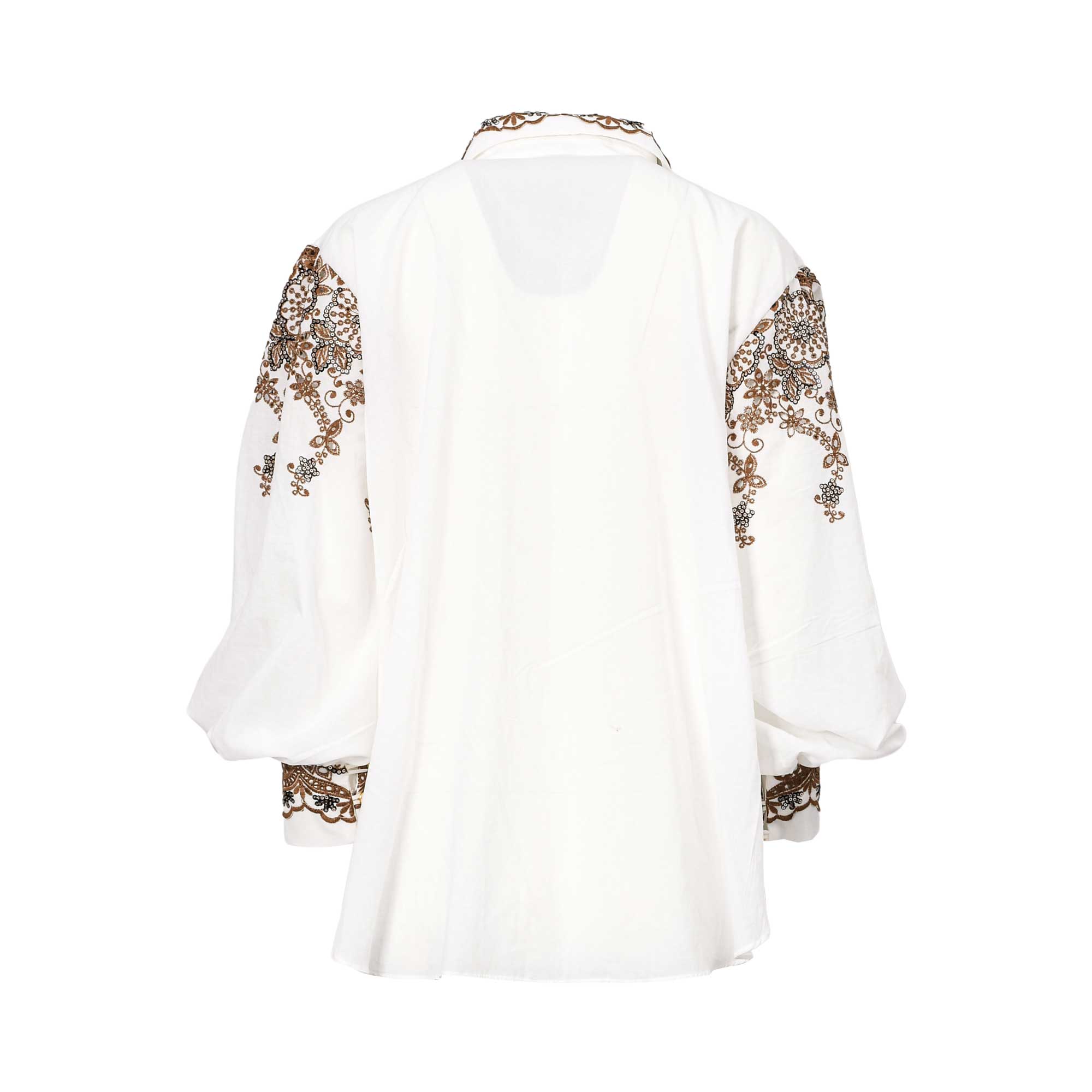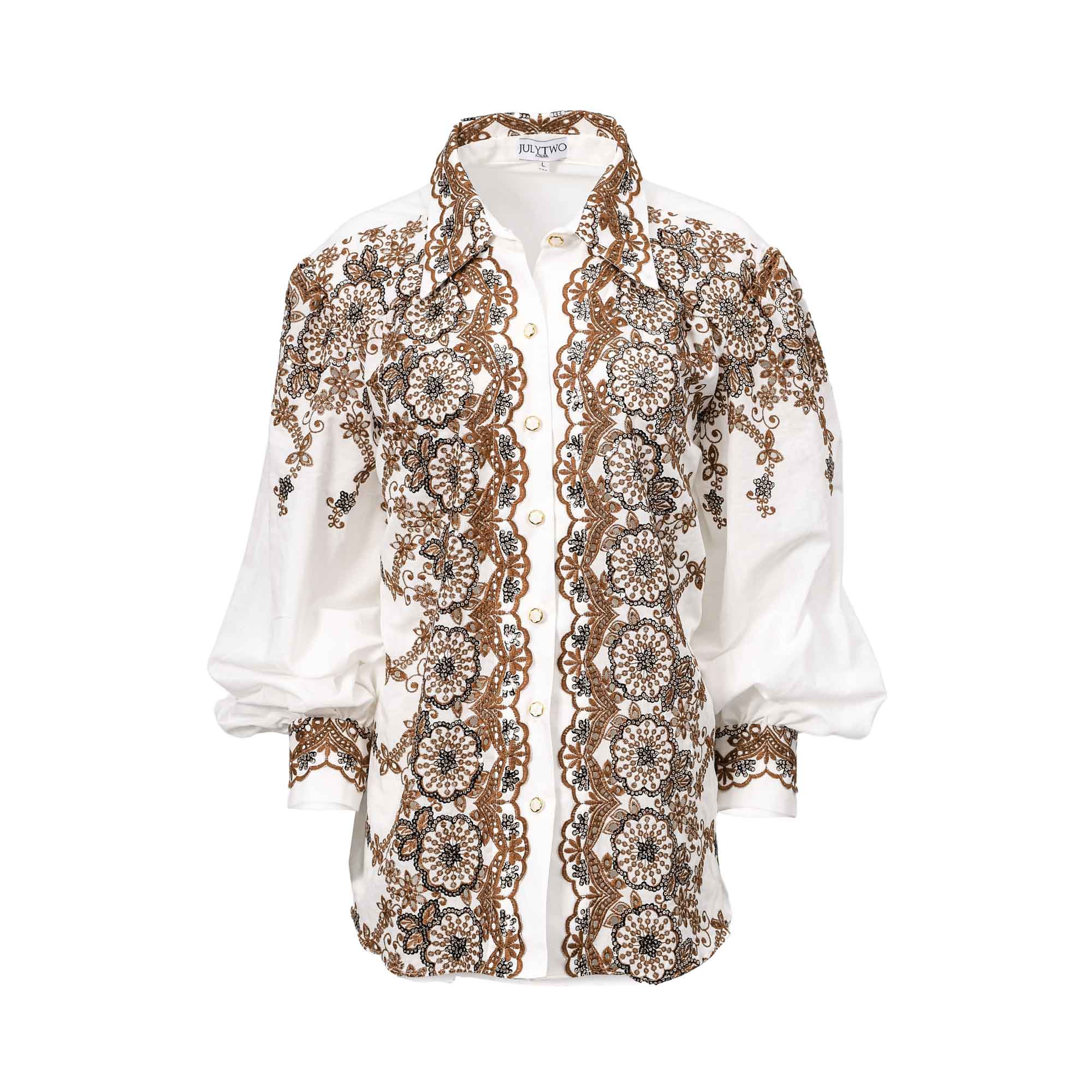 The shirt is designed to be flattering for all body types, with a loose fit that drapes nicely on the body. It can be dressed up or down, making it suitable for both casual and formal occasions. It is also versatile enough to be worn with a variety of bottoms, such as jeans, skirts, or dress pants. The Julytwo Women's Multi-color Shirt is a must-have in any woman's wardrobe. Its stylish design, comfortable fit, and beautiful embroidery make it a statement piece that is sure to turn heads wherever you go.