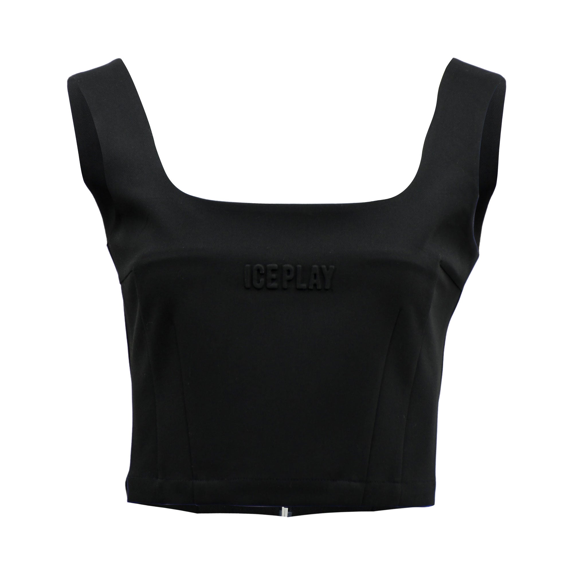 The Ice Play Women's Black Top is a stylish and versatile clothing piece that is perfect for a variety of occasions. It features a square neck and sleeveless design, giving it a modern and chic look. The open back adds a touch of sexiness to the top, while the straight hemline provides a clean and polished finish. The top has a back zip closure, ensuring a secure and snug fit. Its black color makes it easy to pair with different bottoms and accessories, making it a must-have in any woman's wardrobe. Whether for a casual day out or a night out, the Ice Play Women's Black Top is a great choice for effortless style.
