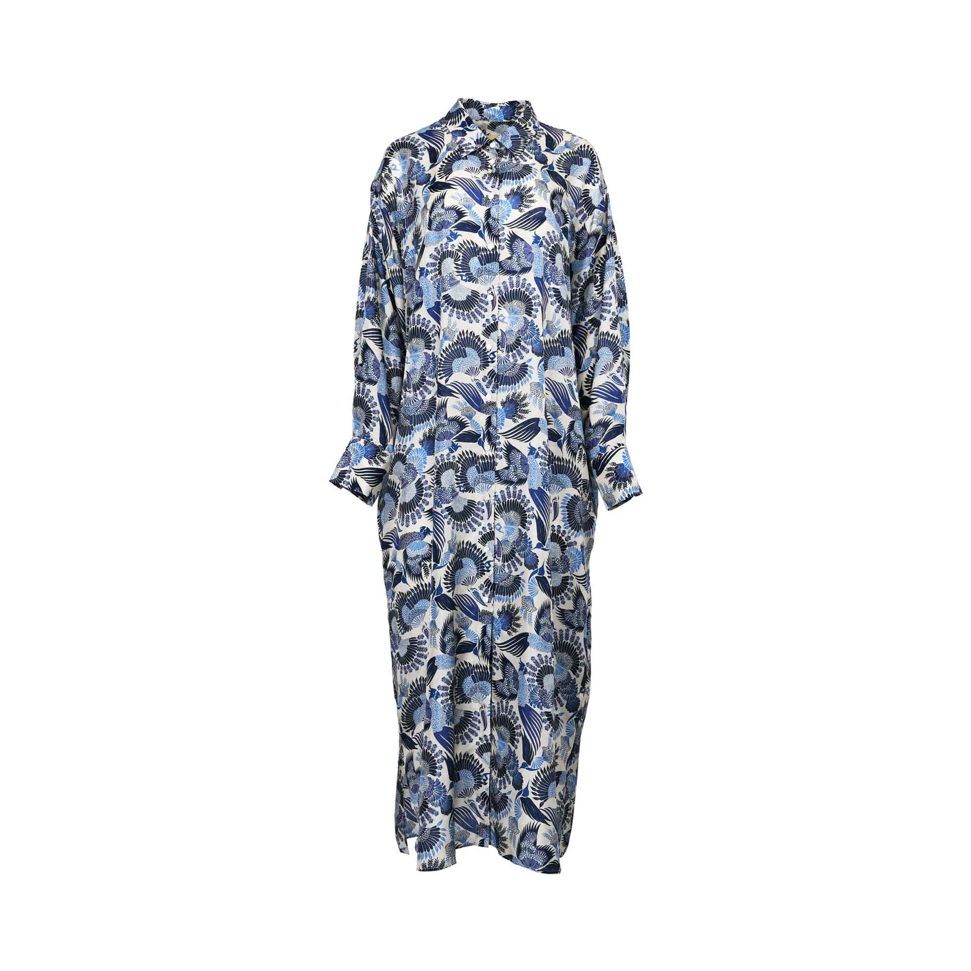 The Momoni Women's JAU Multicolor Dress in Printed Habutai is a striking maxi shirtdress that seamlessly combines casual elegance with contemporary style. Crafted from luxurious printed habutai silk, it features a visible front button fastening that runs down the shirt collar, adding a classic yet modern touch. The long sleeves with shirt cuffs provide a polished look, while the rounded hem at the front and straight hem at the back introduce subtle design details that elevate the overall aesthetic. Side slits enhance ease of movement and add a relaxed, flowing silhouette, making this dress ideal for effortlessly stylish daytime outings or more dressy occasions. Embodying Momoni’s signature approach to blending luxurious fabrics with versatile design, the JAU dress is a versatile, eye-catching piece perfect for those seeking a blend of comfort and high-end fashion.