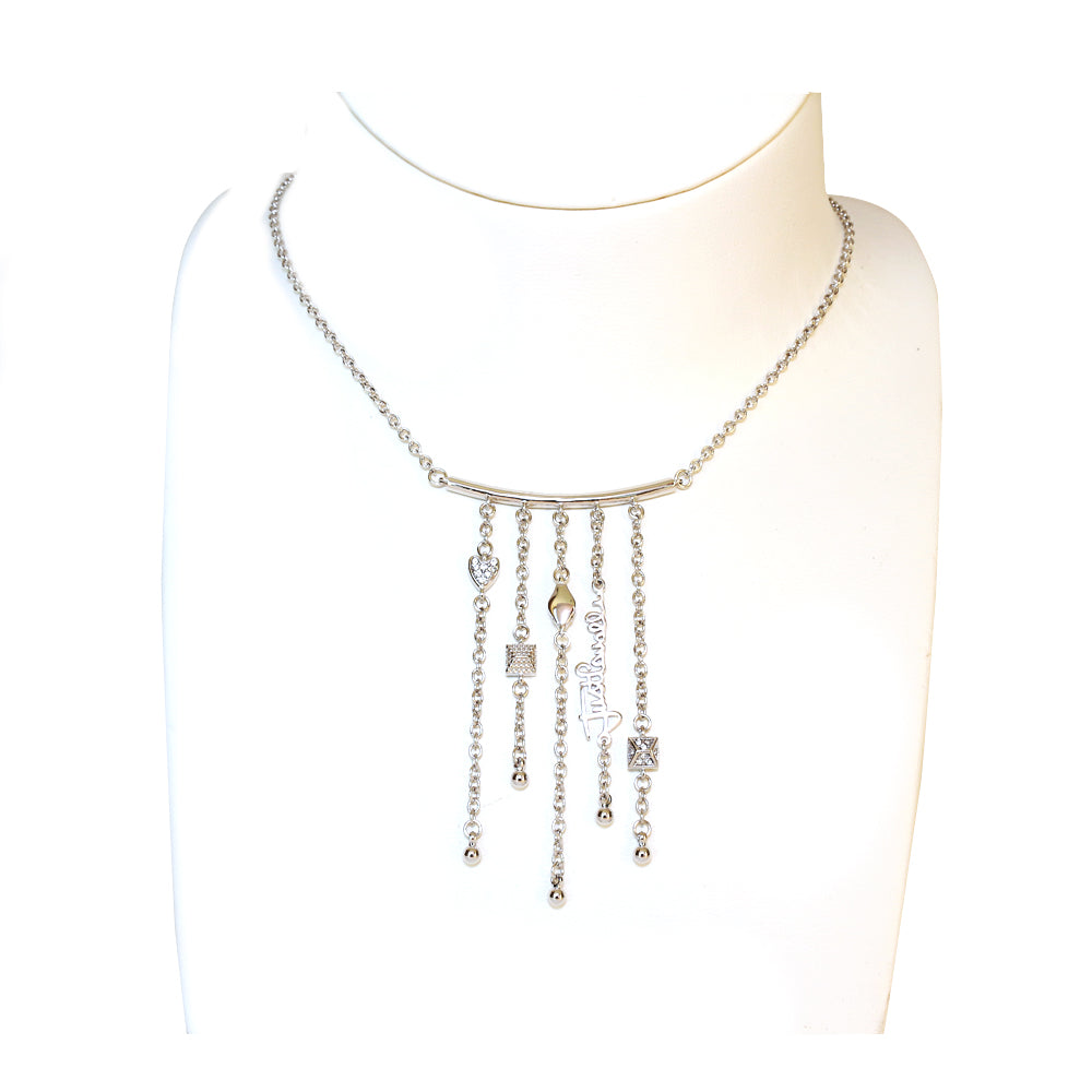 Just Cavalli is a high-end fashion brand known for its edgy and experimental designs. Their fashion accessories, like this necklace, showcase the brand's signature style of blending luxury and boldness. This necklace features a silver chain with a silver dangling design, giving it a unique and eye-catching look. The charm of the necklace includes the iconic Just Cavalli logo and a snake head, representing the brand's wild and adventurous spirit. What sets this necklace apart is the addition of a stone, adding a touch of elegance to the overall design. It is a perfect accessory for someone who wants to make a statement with their fashion choices. The attention to detail and quality craftsmanship make this necklace a must-have for fashion enthusiasts who appreciate luxury and modern design.