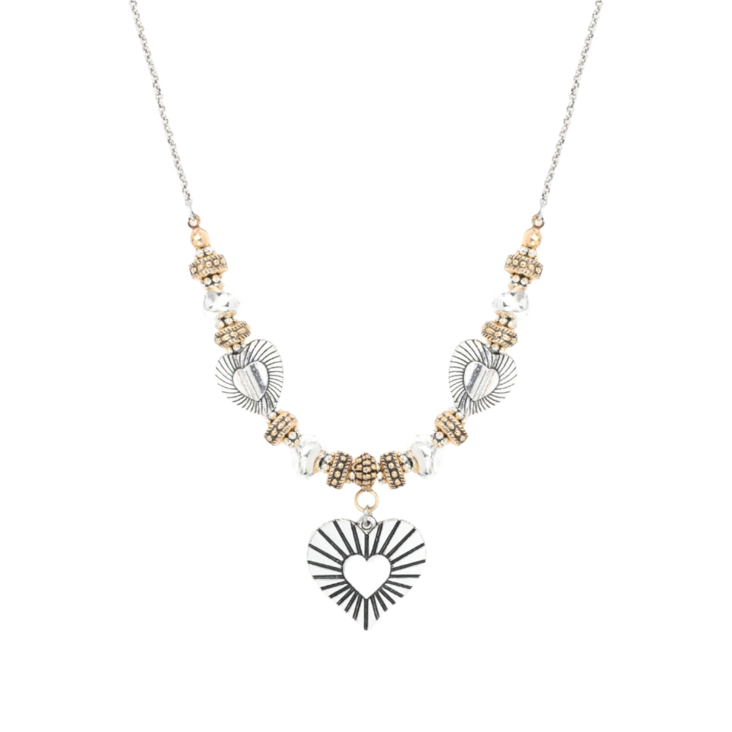 The Reminiscence Women's Gold & Silver Necklace is a stunning piece of jewelry that combines elegant design with playful details. Made from high-quality gold and silver materials, this necklace features intricate hearts detailing that adds a romantic touch to the overall look. The necklace is delicately beaded, giving it a unique and eye-catching texture that will surely be noticed. It is a versatile accessory that can be worn for both casual and formal occasions, making it a perfect addition to any woman's jewelry collection. With its timeless beauty and intricate craftsmanship, the Reminiscence Women's Gold & Silver Necklace is a must-have for anyone who loves classic yet stylish jewelry.