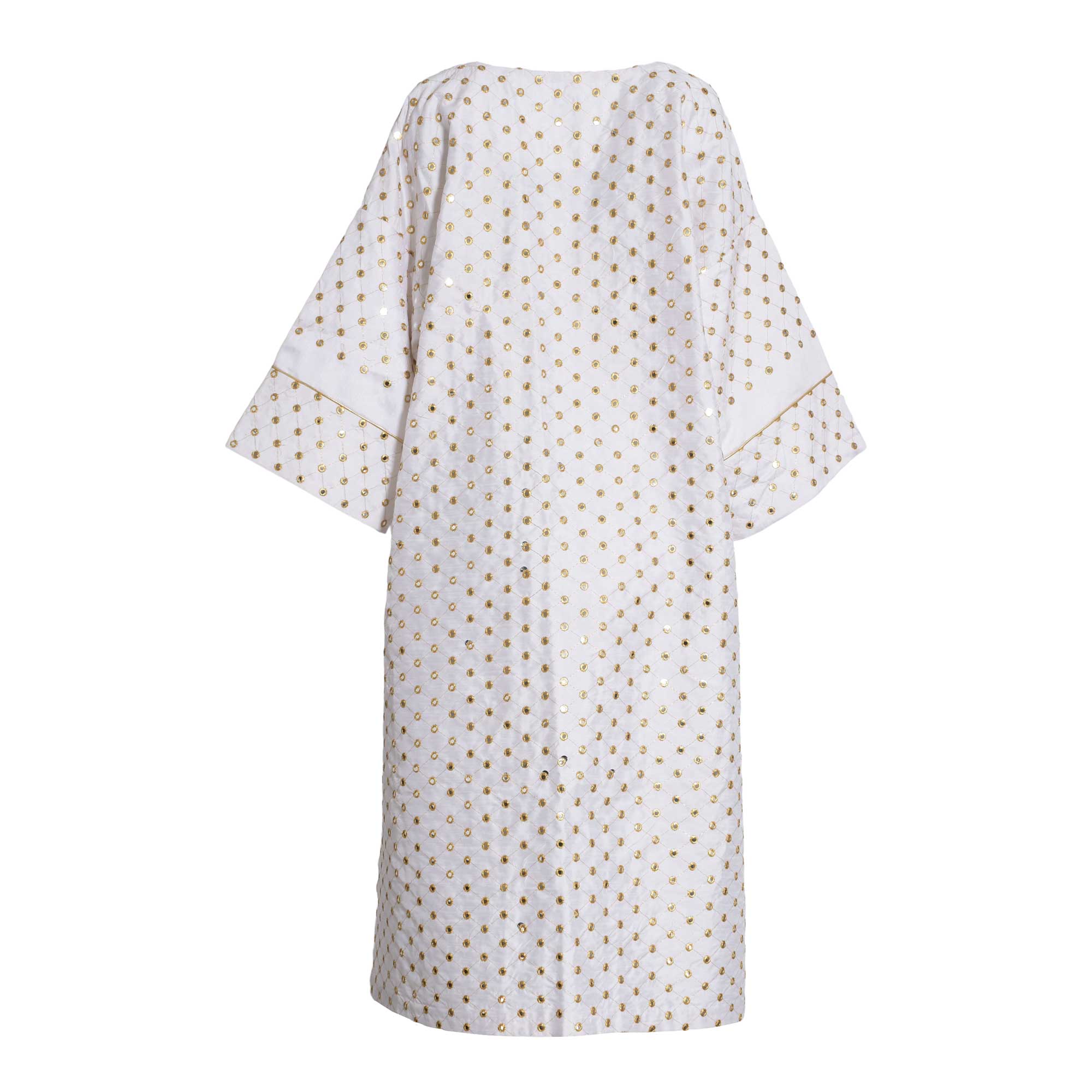 This Fahm Women's Off-White Dress is ideal for a casual day or evening out. It features a free size, long loose sleeves, round neck with slit and mirror work in golden thread all over. The dress is trim with with golden pipeline and side slits on both sides. The dress is made of fine fabric that is comfortable and provides a great fit. It is sure to give you a stylish and elegant look. This dress is perfect for any occasion and will definitely make a statement. Whether you pair it with flats or heels, you will be sure to stand out from the crowd. SPECIFICATIONS: