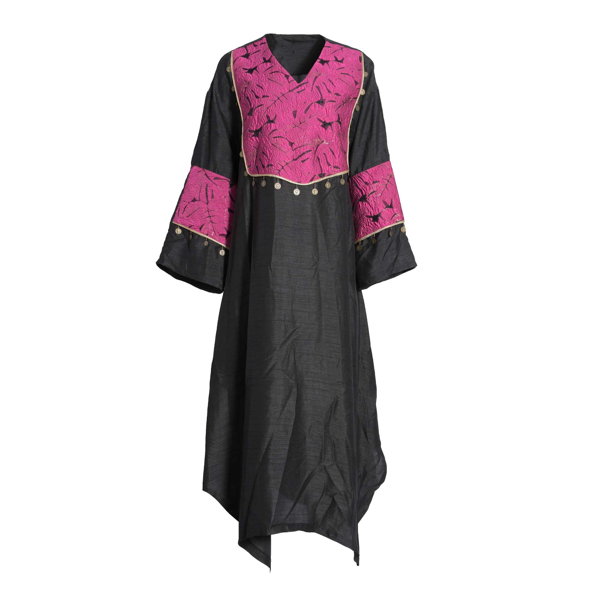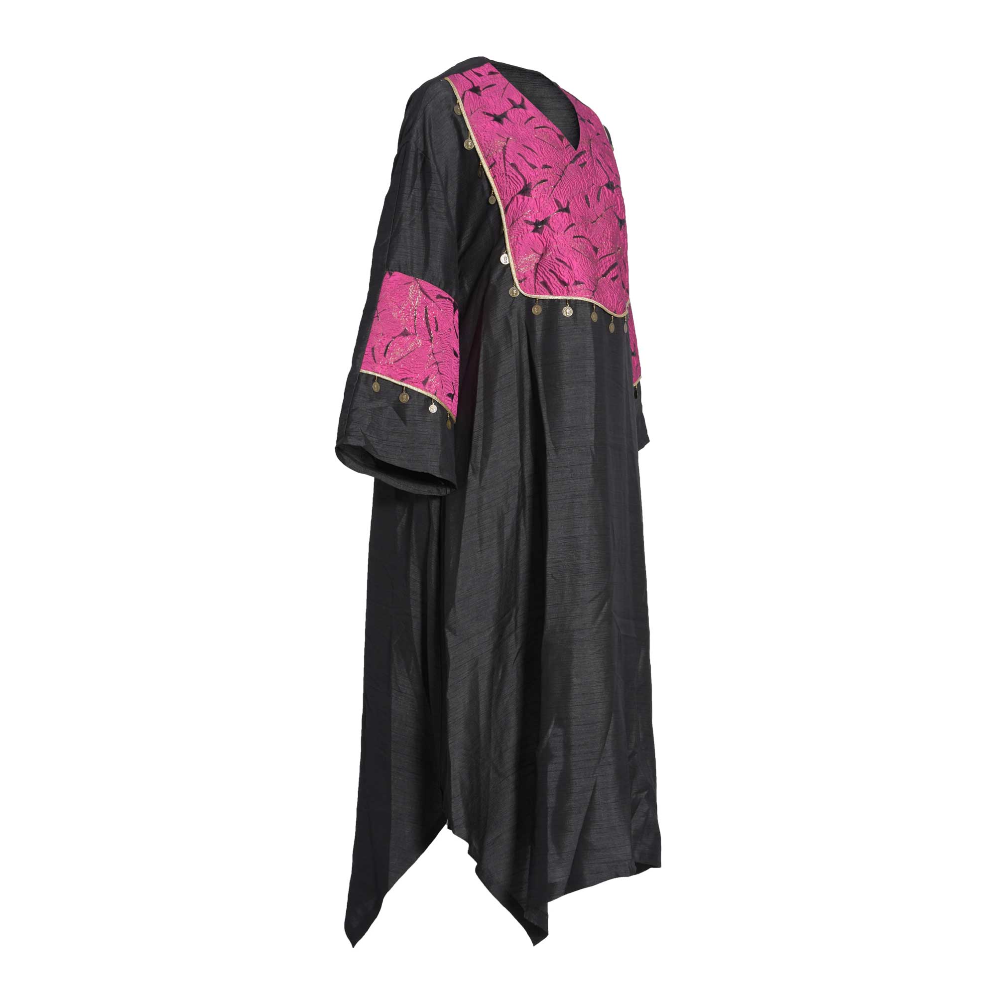 This Fahm Women's Black Dress is a perfect choice for any special occasion. The dress features a unique and stylish purple fabric pattern to the front and sleeves, with long loose sleeves and a v-neck. The dress also features coins detailing on the front and sleeves which adds a unique and stylish touch. The fabric is lightweight and comfortable, making it perfect for any season. The free size makes the dress perfect for a variety of body sizes and shapes. The dress is sure to make a statement and make you feel beautiful and confident. Whether you're attending a formal event or just spending an evening out with friends, you'll be sure to impress in this Fahm Women's Black Dress.