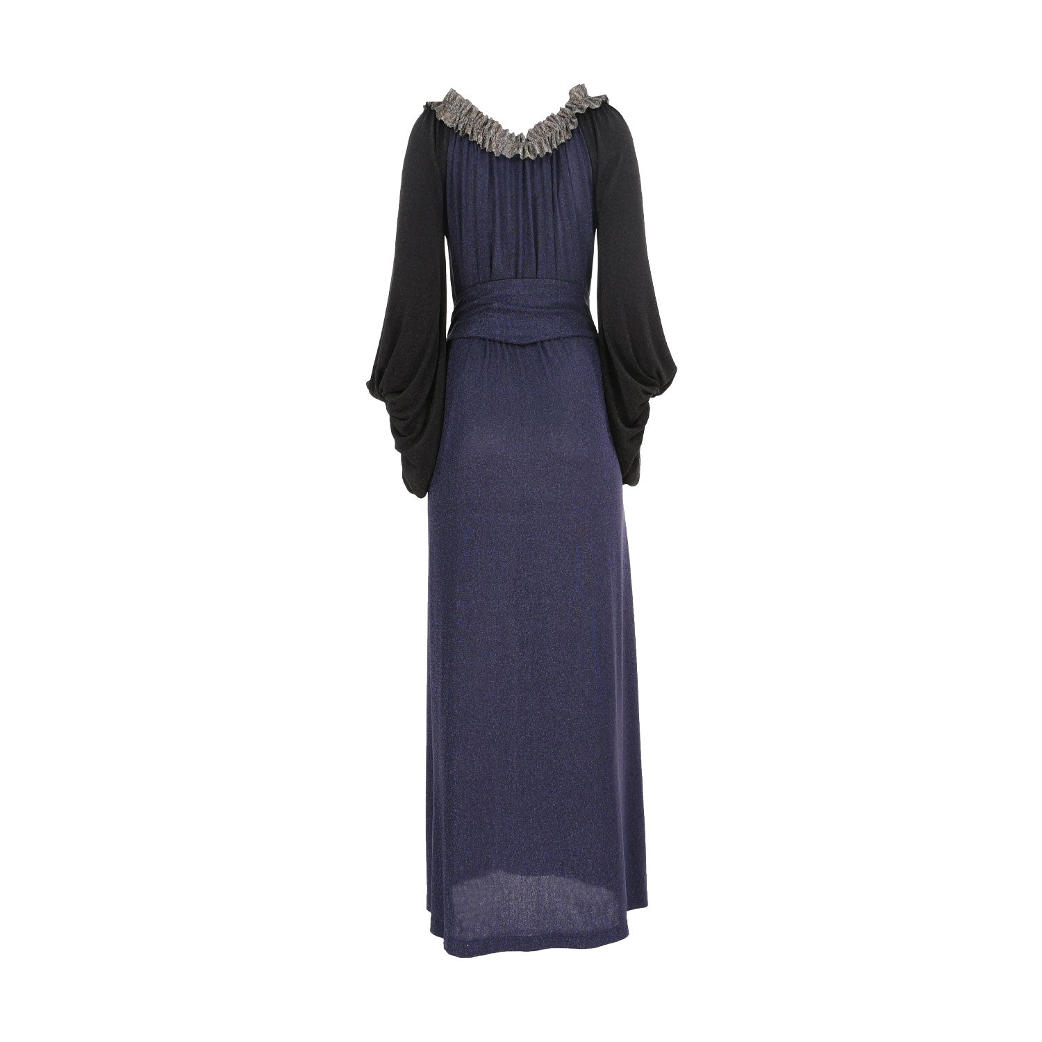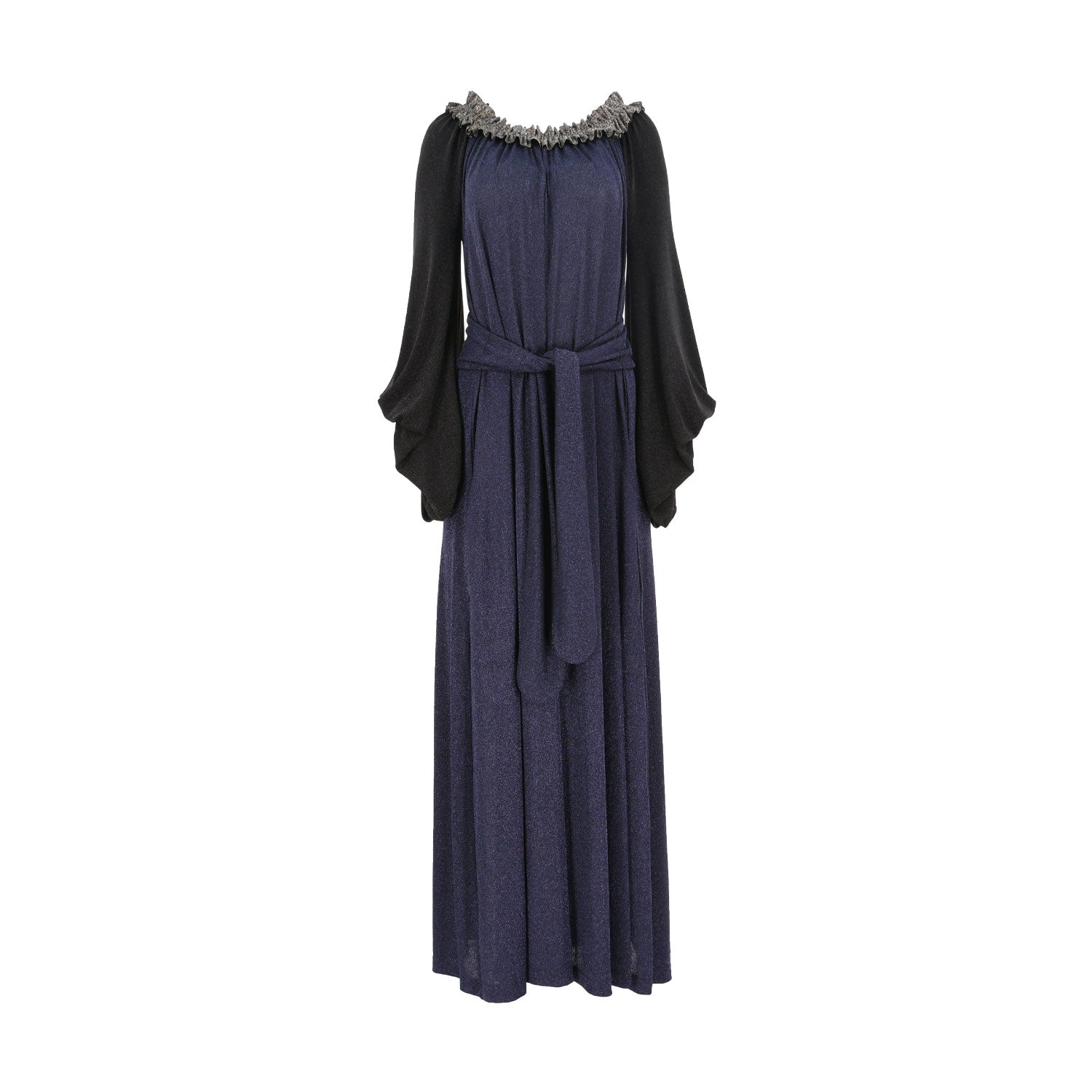The Baruni Women's Blue Long Dress is a stunning piece crafted from luxurious lurex knit fabric that adds a subtle shimmer and elegant texture. Featuring a broad ruffle neckline, the dress offers a graceful and feminine touch that enhances its overall charm. Designed with long raglan sleeves and elasticated cuffs, it provides both comfort and a flattering silhouette. The waist tie-up belt cinches the waist beautifully, accentuating the figure and adding a personalized fit. Perfect for special occasions or sophisticated everyday wear, this long dress effortlessly combines style, comfort, and timeless elegance.