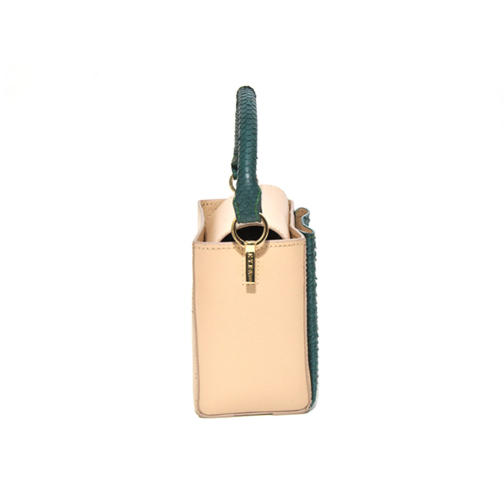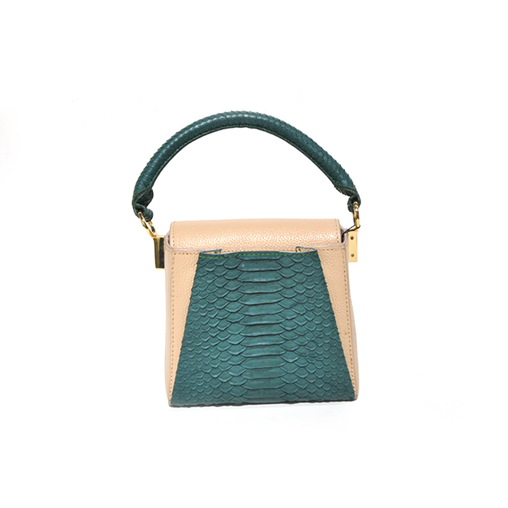 The design is exquisite in appearance and drew inspiration from a timeless structure with a feministic twist. Karina Cream Turquois comes in sizes small and has a handle and front pocket in the shape of a trapezoid. The shoulder strap can be adjusted to suit your preferences, making this bag ideal for carrying your essentials for the day. Because it doesn't have a partition inside, there's plenty of room for your items. The bag is one of a kind and was crafted with a keen attention to detail. Unlike other bags, this one comes in a unique hue that symbolizes a strong individual with an optimistic outlook.
