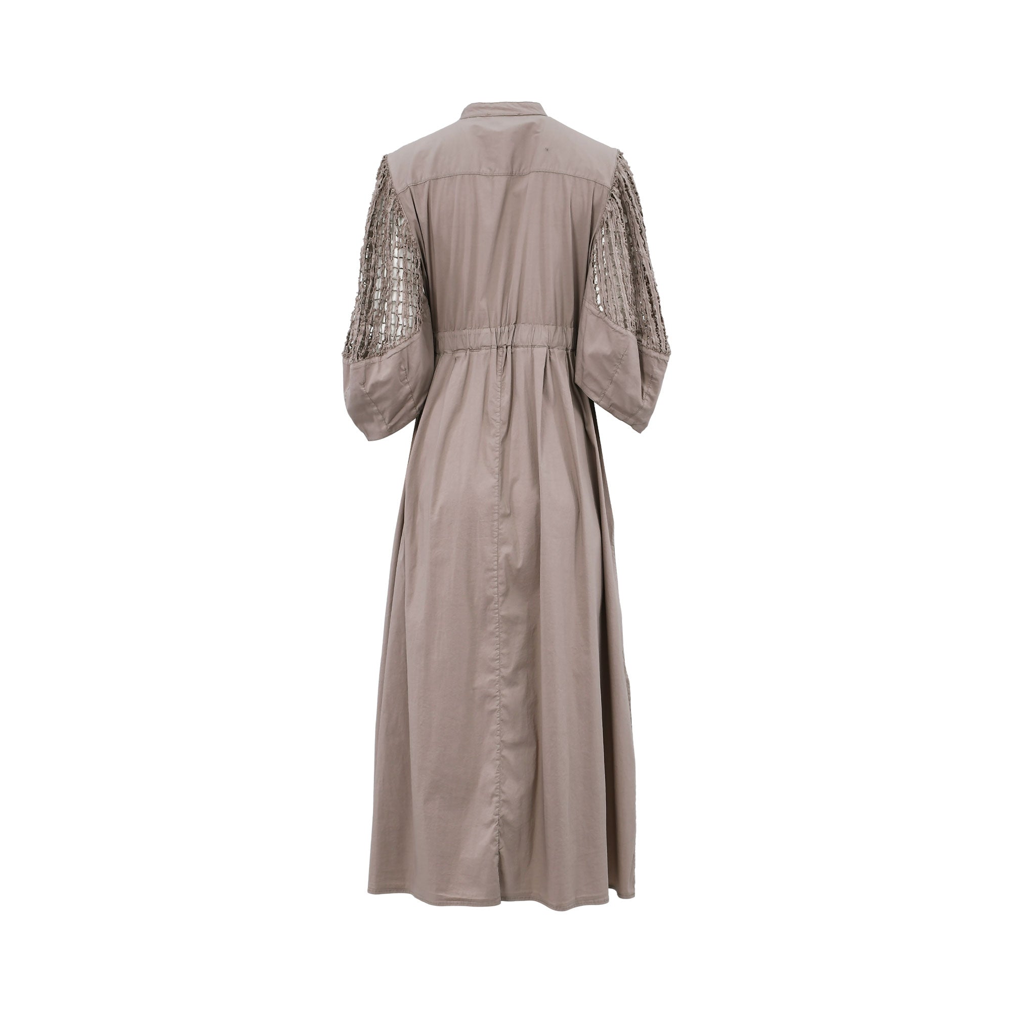 The dress boasts a stand collar that can be worn buttoned up for a more structured look or open for a relaxed feel. The button-down front extends to the midi-length hem, offering versatility in styling – wear it fully buttoned as a dress or open as a light layer.
