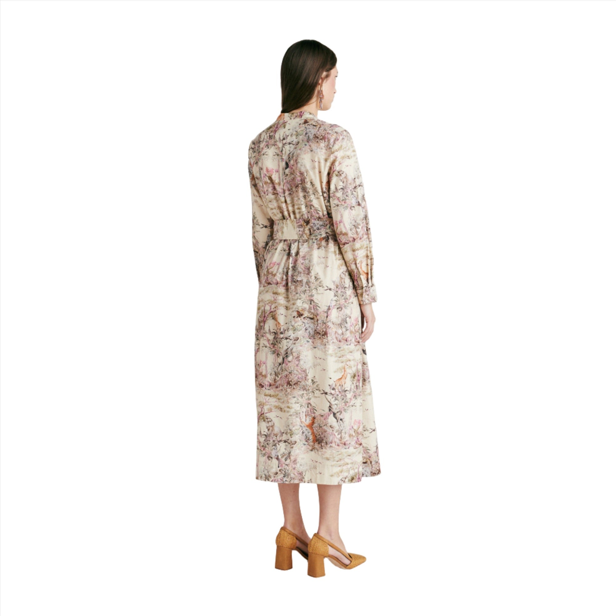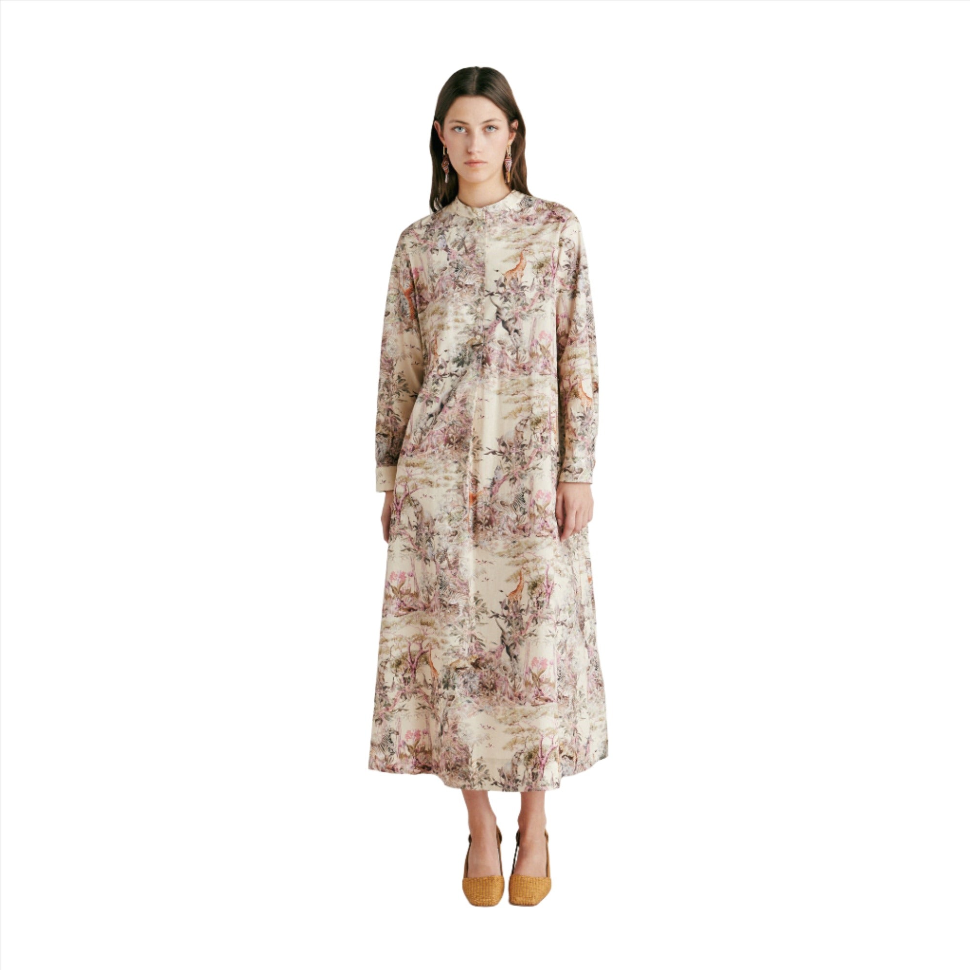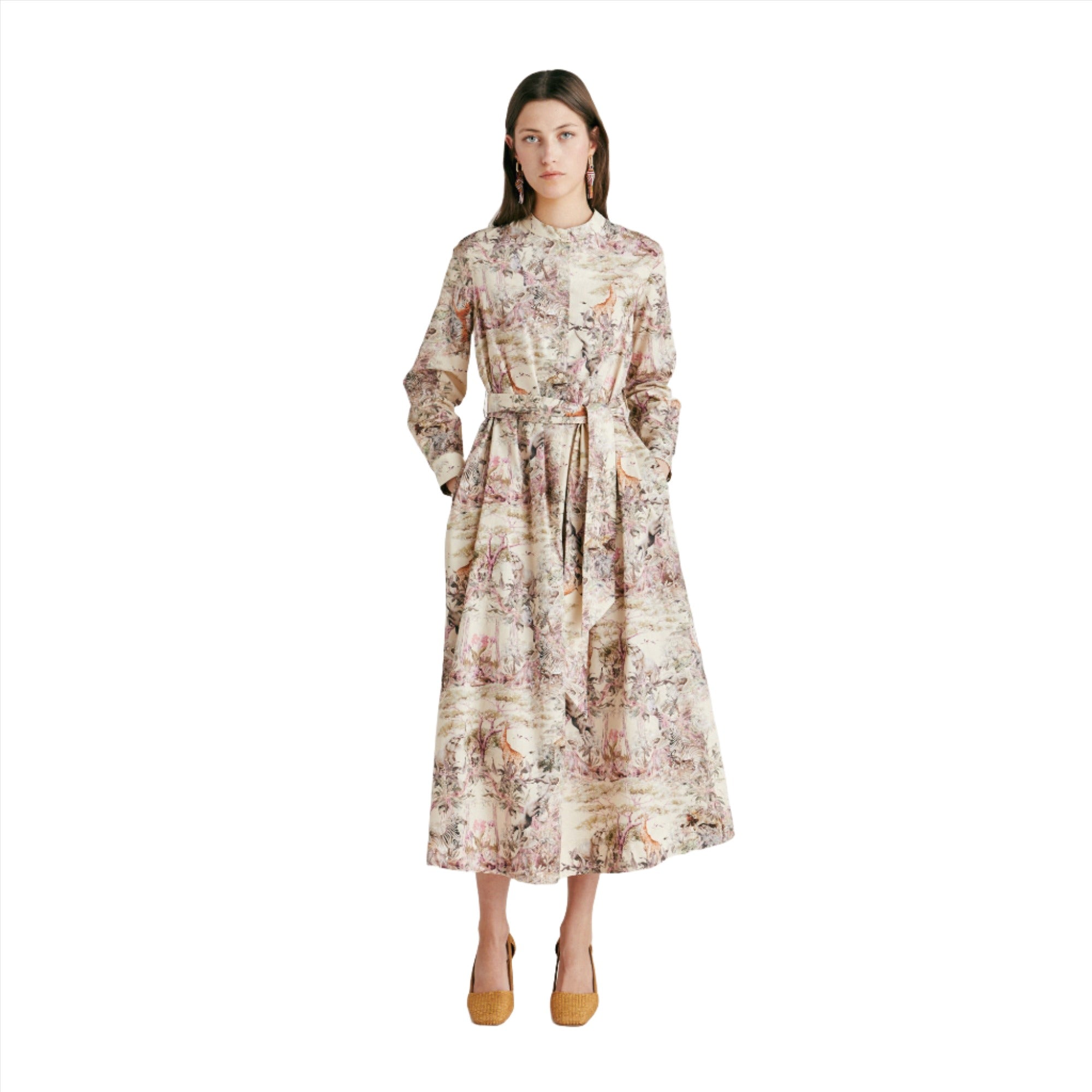 • Printed cotton poplin dress with minimal lines and sash to emphasize the waist. Mandarin collar and polo shirt style neck fastened with small buttons. Long sleeves with shirt cuffs.