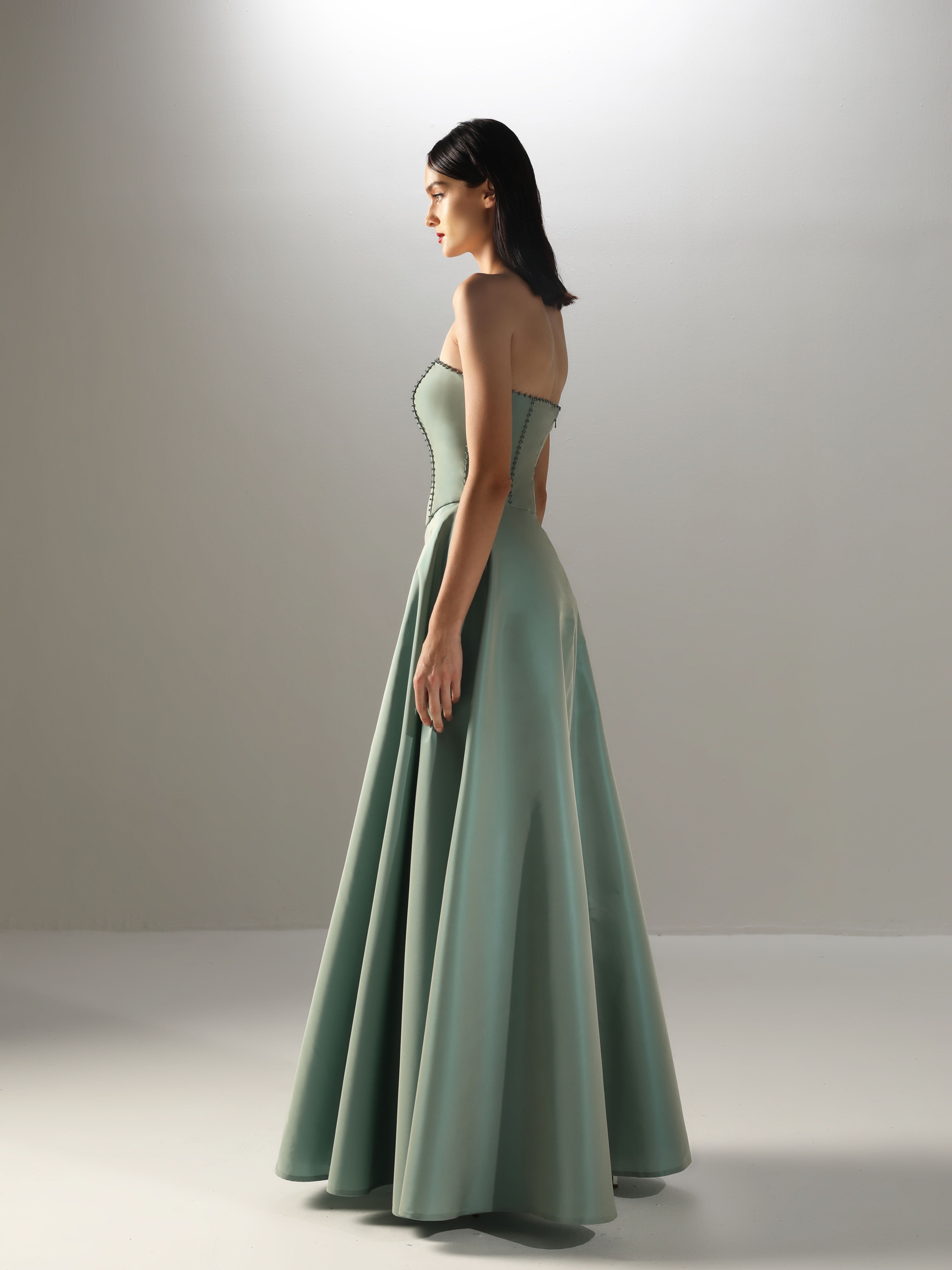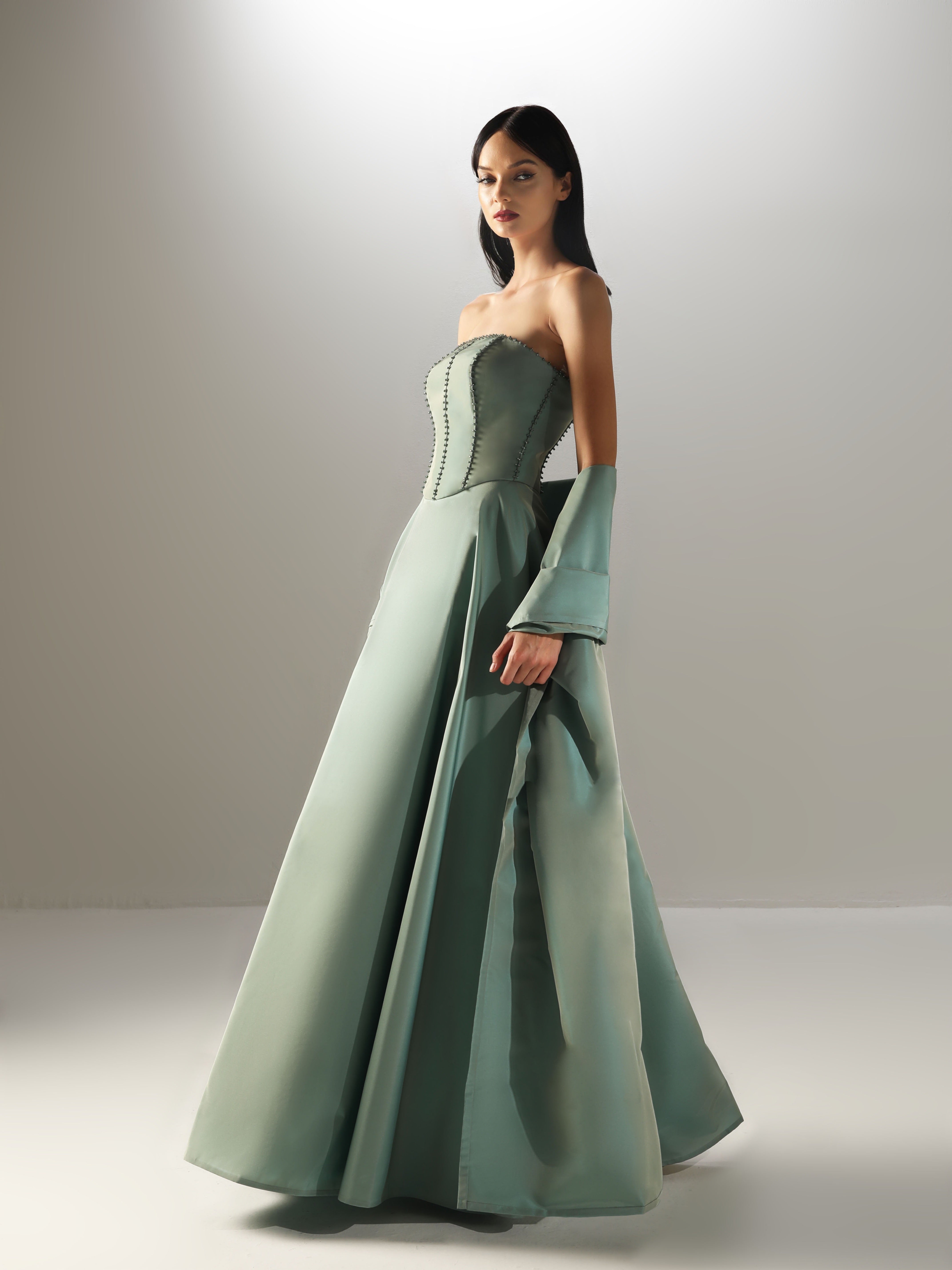 | The Velvety Couture Women's AIMI Gown in Misty Mint is a stunning embodiment of elegance and fine craftsmanship, designed to captivate at any formal occasion. This exquisite maxi gown is made from luxurious taffeta, a fabric known for its structured elegance and slight sheen, which adds a touch of sophistication to the dress. The Misty Mint color lends a fresh and serene vibe, making it an ideal choice for spring or summer events and adding a refreshing twist to classic evening wear. One of the most striking features of the AIMI Gown is its straight across neckline, which is beautifully adorned with hand-embroidered stones. This intricate embellishment adds a layer of sparkle and sophistication, drawing attention to the neckline and framing the wearer's face with a touch of glamour. The gown's silhouette is designed to flatter, with its maxi length providing an elongating effect that adds to its opulence. The structured taffeta ensures that the gown drapes beautifully, maintaining its elegant shape throughout the evening. Its classic and timeless design makes it suitable for a variety of formal events, from galas to weddings. The Velvety Couture Women's AIMI Gown in Misty Mint is a masterpiece of modern elegance and traditional craftsmanship. SPECIFICATIONS • Brand: Velvety Couture • Gender: Women • Elegant Design: Captivating maxi gown crafted for formal occasions. • Luxurious Fabric: Made from taffeta, offering structured elegance and sheen. • Color: Misty Mint provides a fresh, serene vibe, perfect for spring/summer. • Neckline Feature: Straight across neckline adorned with hand-embroidered stones. • Intricate Embellishment: Adds sparkle and sophistication, highlighting craftsmanship. • Flattering Silhouette: Maxi length for an elongating effect and opulent look. • Drape and Shape: Structured taffeta ensures beautiful draping and shape retention. • Versatile Elegance: Suitable for a range of formal events, including galas and weddings. • Washing Instructions: Dry clean • Do not bleach • Do not tumble dry About Brand Velvety Couture was founded in 2009 by two sisters Fatima and Latifa Al Shammari. Their ambition to make a special imprint in the world of fashion was behind establishing Velvety. The brand has grown over the years to distinguish itself as a brand that combines authenticity with modernity. The growth has followed by having a production house and opening two branches in Dubai and Abu Dhabi. In addition to that, the collection has been displayed in luxurious multidesigner stores. |