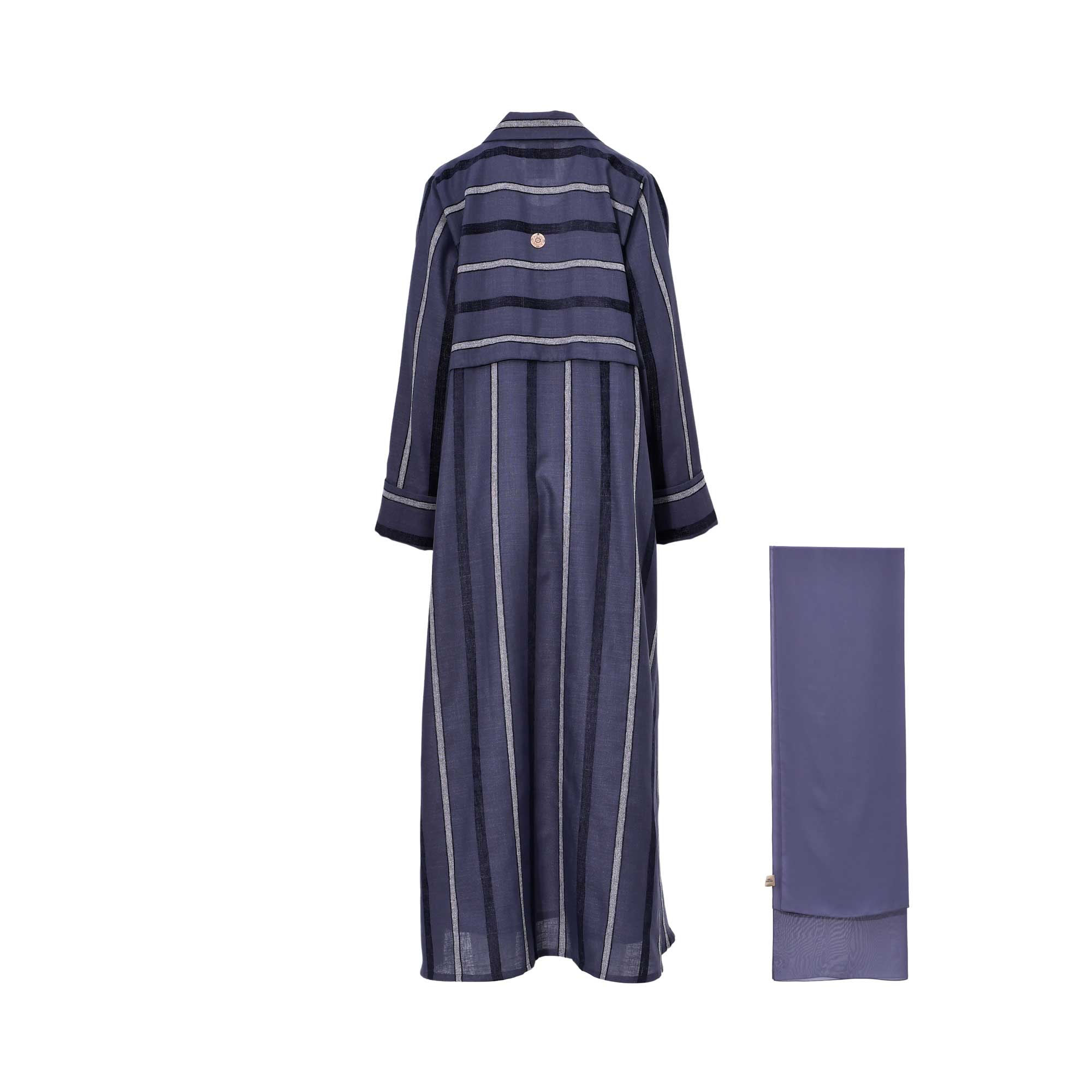 This stylish abaya set features a long, flowing abaya with vertical stripes in a lighter shade. The abaya is made from a comfortable and breathable fabric, perfect for everyday wear or special occasions. The set also includes a matching navy blue hijab, completing the ensemble. The abaya's modern design and high-quality craftsmanship make it a beautiful and versatile addition to any wardrobe.