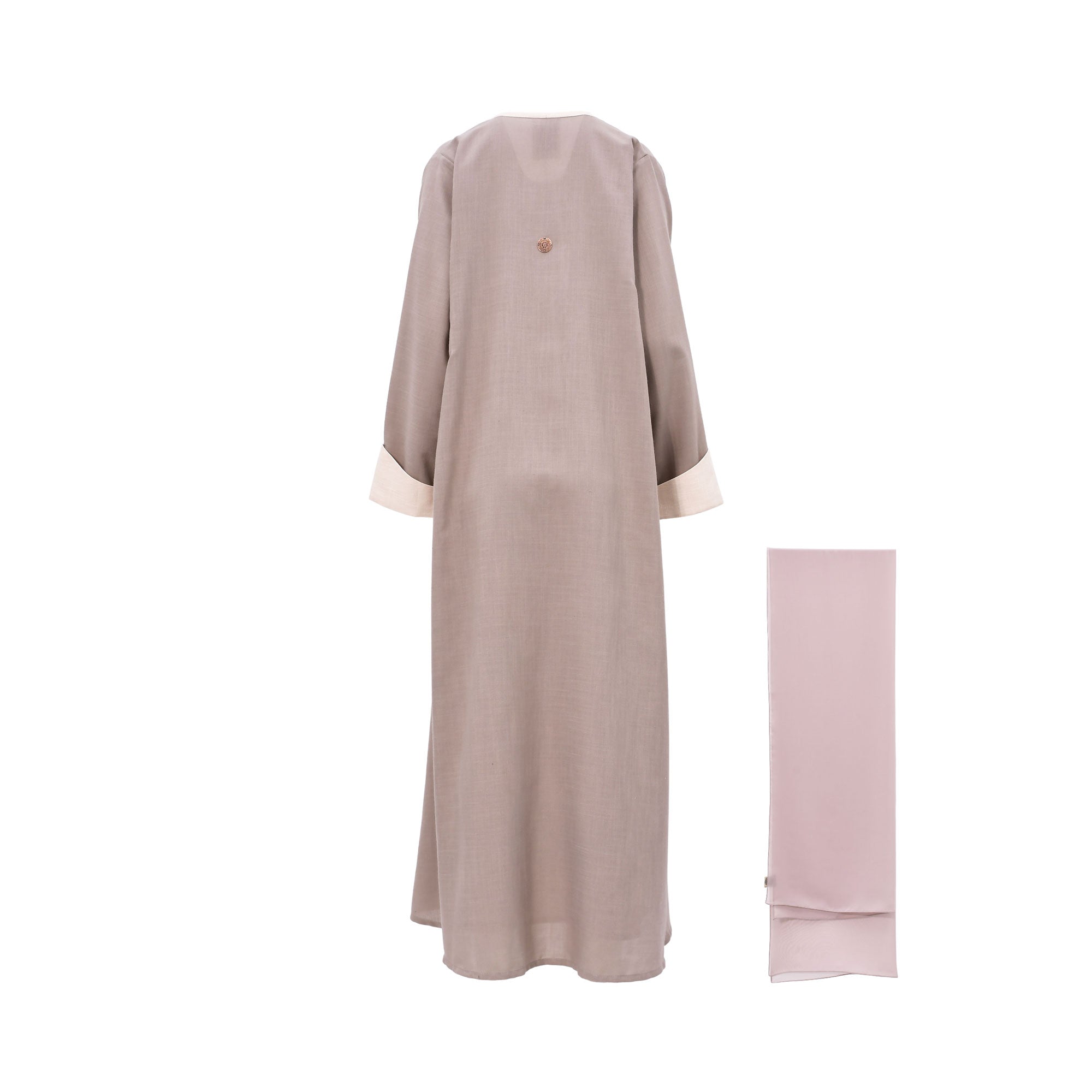 This stylish abaya set features a long, flowing abaya in a soft grey color with intricate embroidery detailing on the sleeves and side panels. The abaya is made from a comfortable and breathable fabric, perfect for everyday wear or special occasions. The set also includes a matching blush pink hijab, completing the ensemble. The abaya's modest design and high-quality craftsmanship make it a beautiful and versatile addition to any wardrobe.