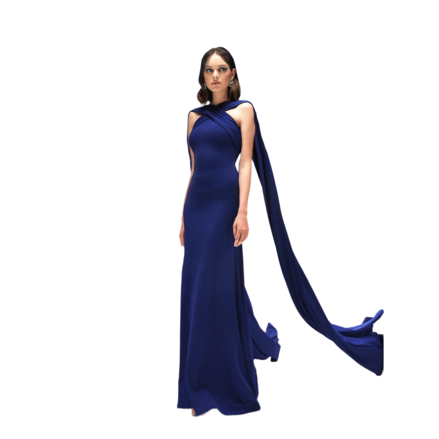 The Velvety Couture Women's CALIN Magnetic Blue Dress is a breathtaking example of sophistication and modern design, perfect for making an elegant statement at any formal occasion. This dress is artfully crafted from luxurious lycra crepe, which provides a sleek, form-fitting silhouette that gracefully complements the body. The sheath-style design is timeless, offering a clean and sophisticated look that is both flattering and versatile. One of the most striking features of the CALIN dress is its captivating "Magnetic Blue" hue. This rich, vibrant shade exudes depth and allure, ensuring that the wearer stands out in any setting. The dress features a chic halter neckline, which beautifully frames the shoulders and adds a touch of contemporary style.  Adding to its distinctive style, the CALIN dress includes an attached, floor-length shawl at the back. This dramatic feature flows gracefully, creating a sense of movement and adding an element of grace to the ensemble. The Velvety Couture Women's CALIN Magnetic Blue Dress is a masterpiece of modern elegance. Ideal for galas, formal events, or any occasion where making a lasting impression is key, this dress is a testament to Velvety Couture's commitment to exquisite craftsmanship and avant-garde fashion.