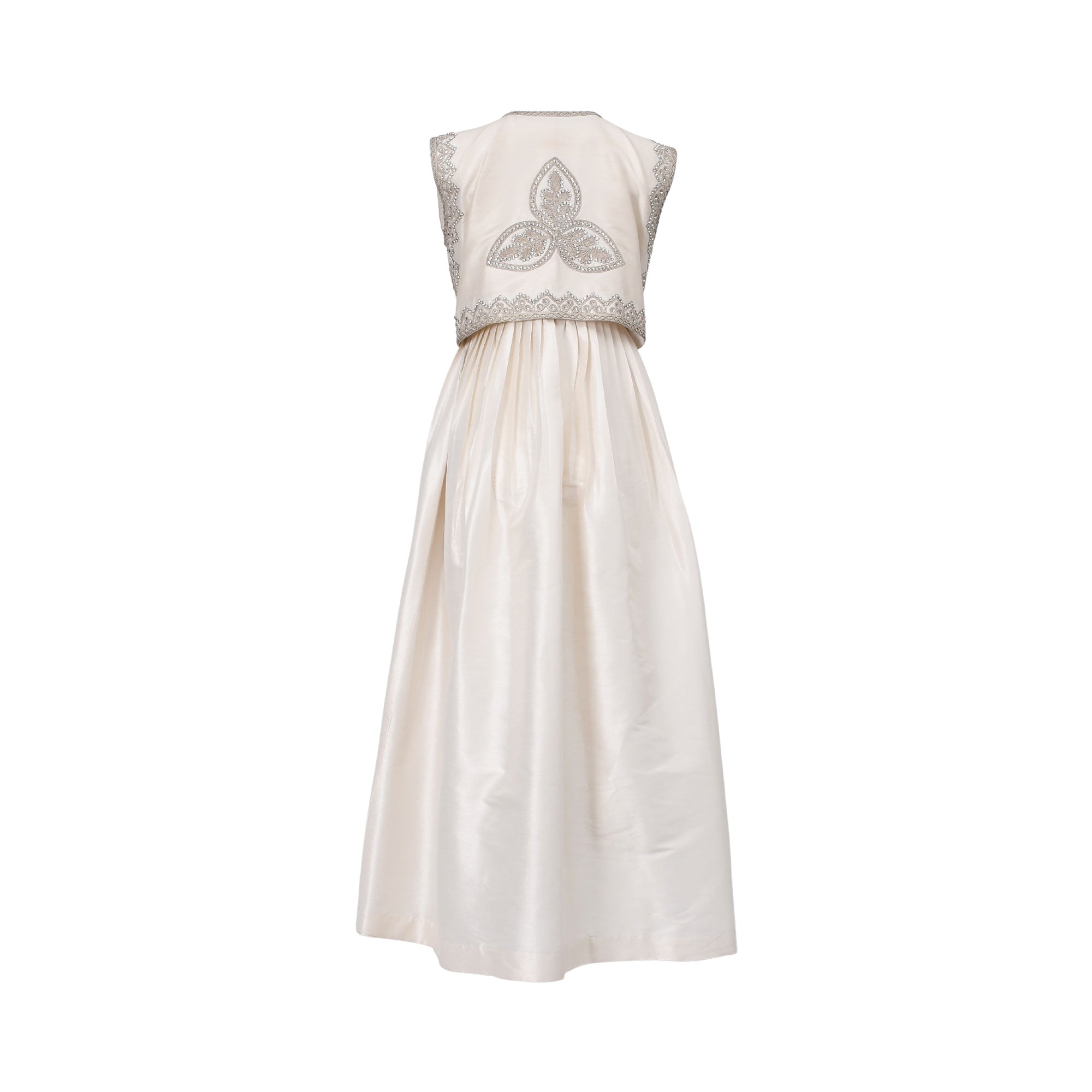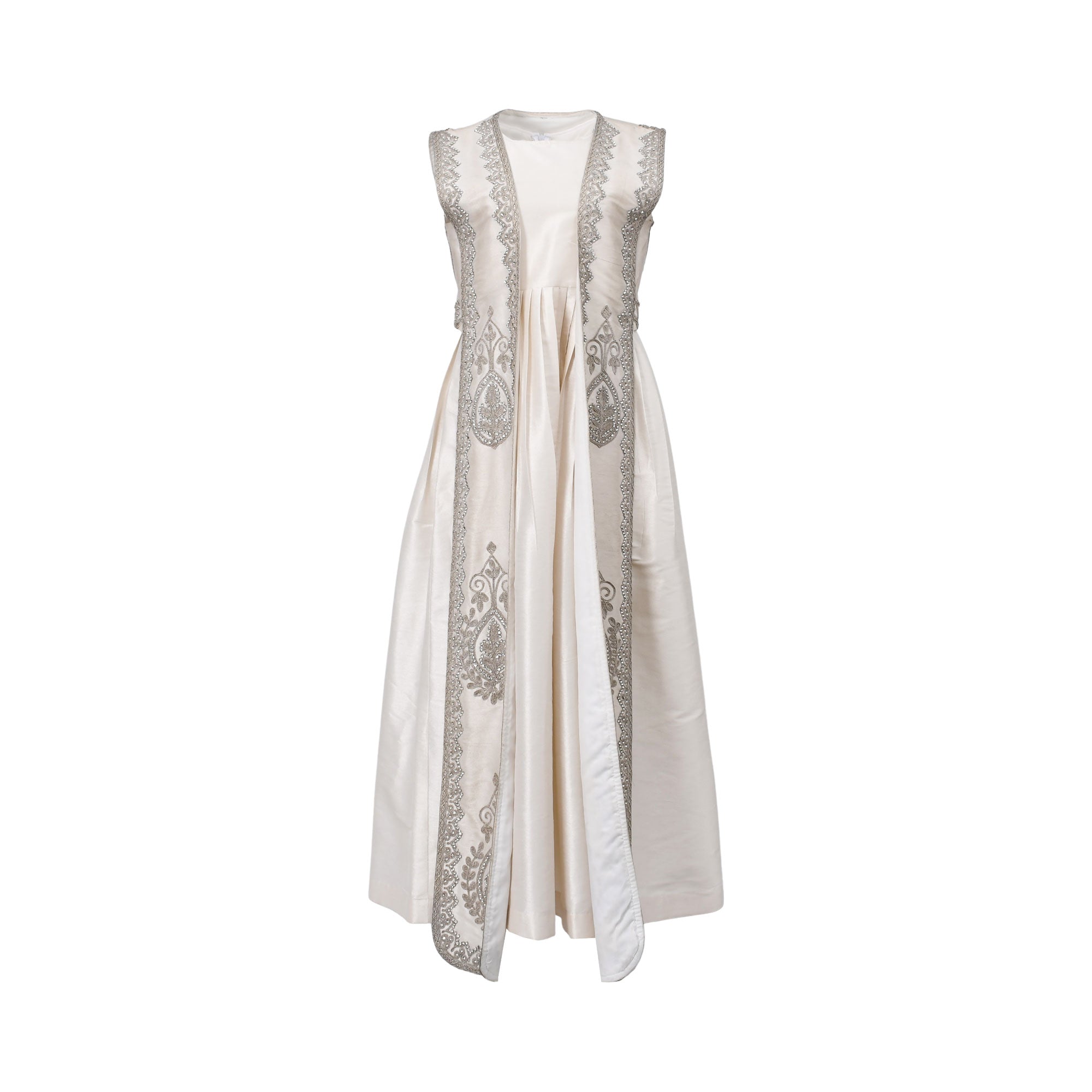 This magnificent full-length piece is presented in a pristine white or off-white hue, featuring a unique design that gives the appearance of a sleeveless inner dress with a flowing, open overcoat. The sleeveless inner layer provides a sleek foundation, while the draped outer panels offer an elegant, flowing maxi silhouette that moves beautifully. The neckline is a classic rounded style.