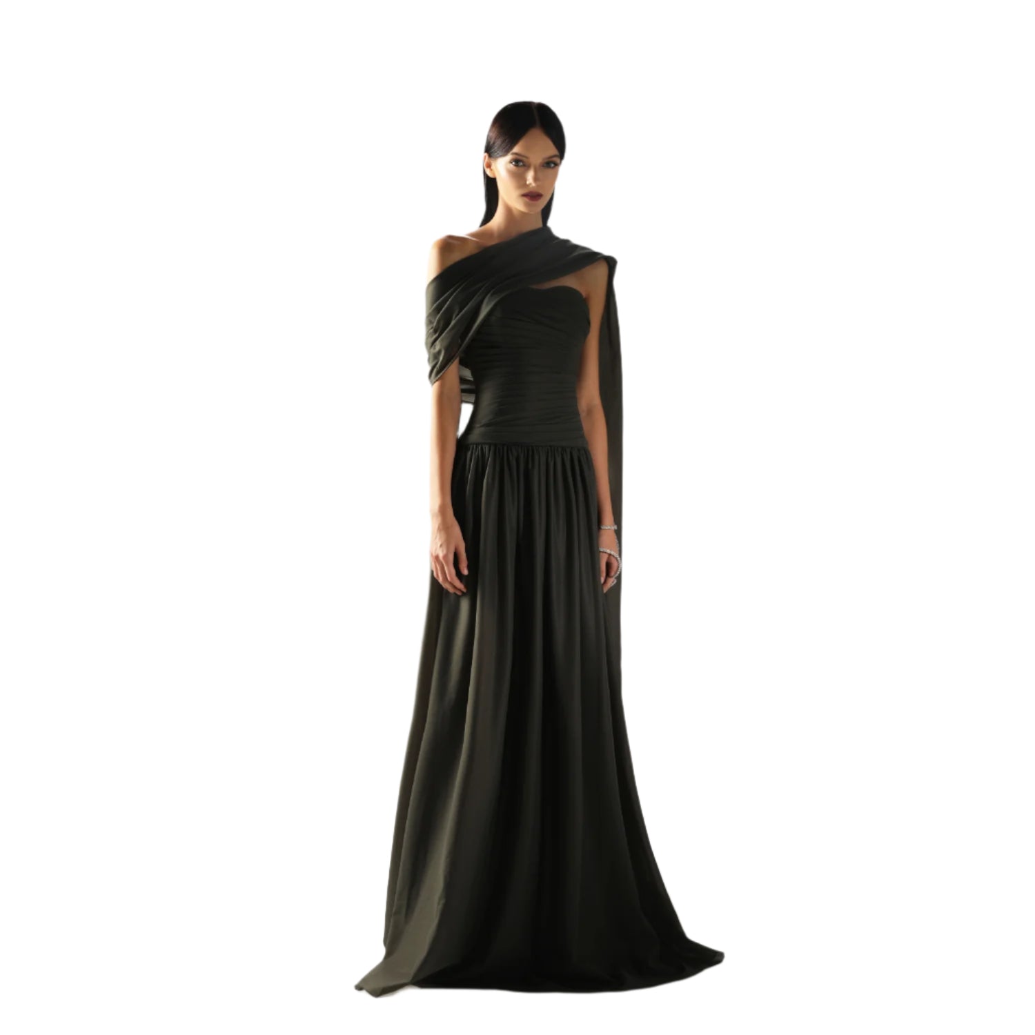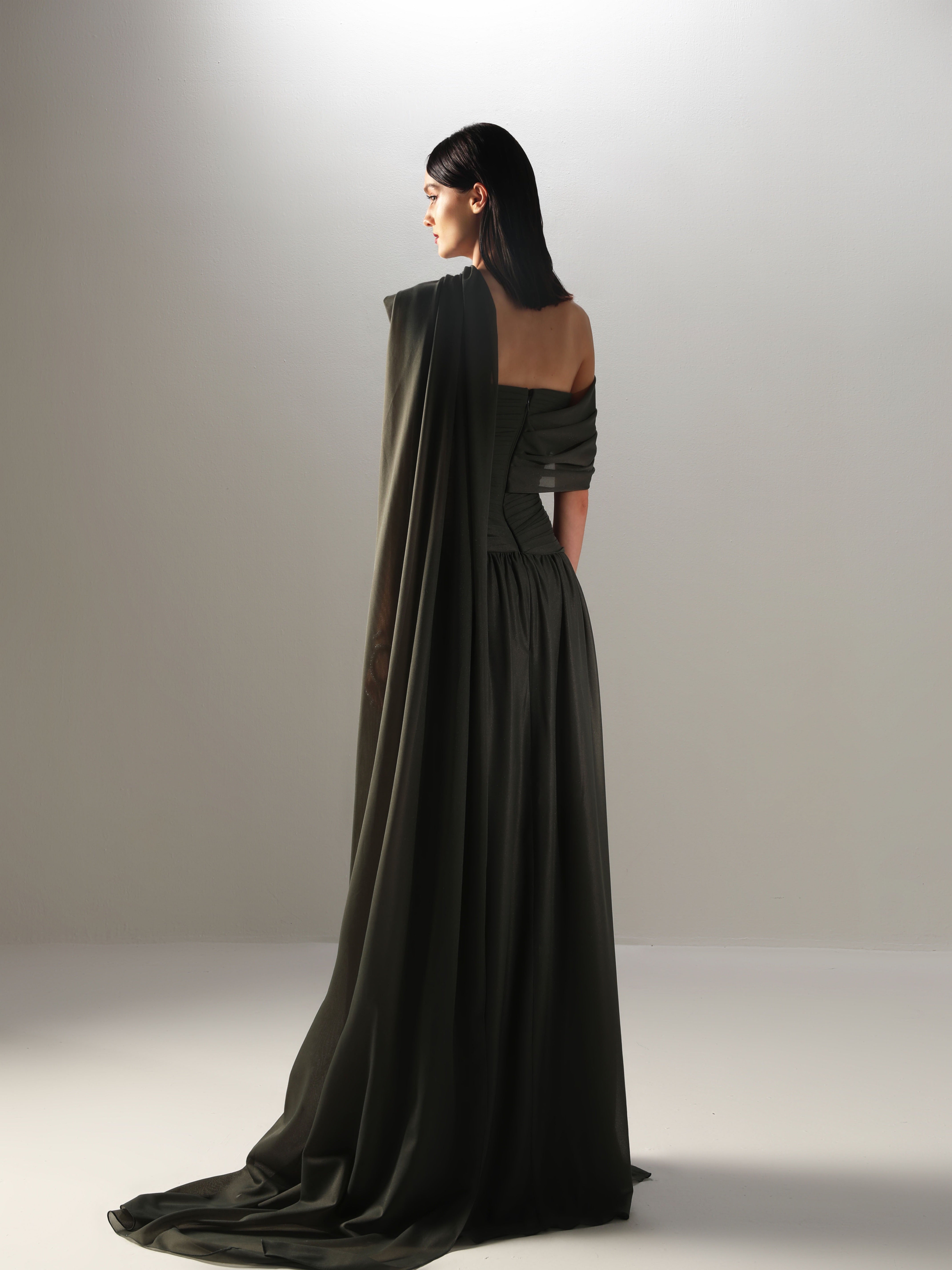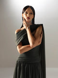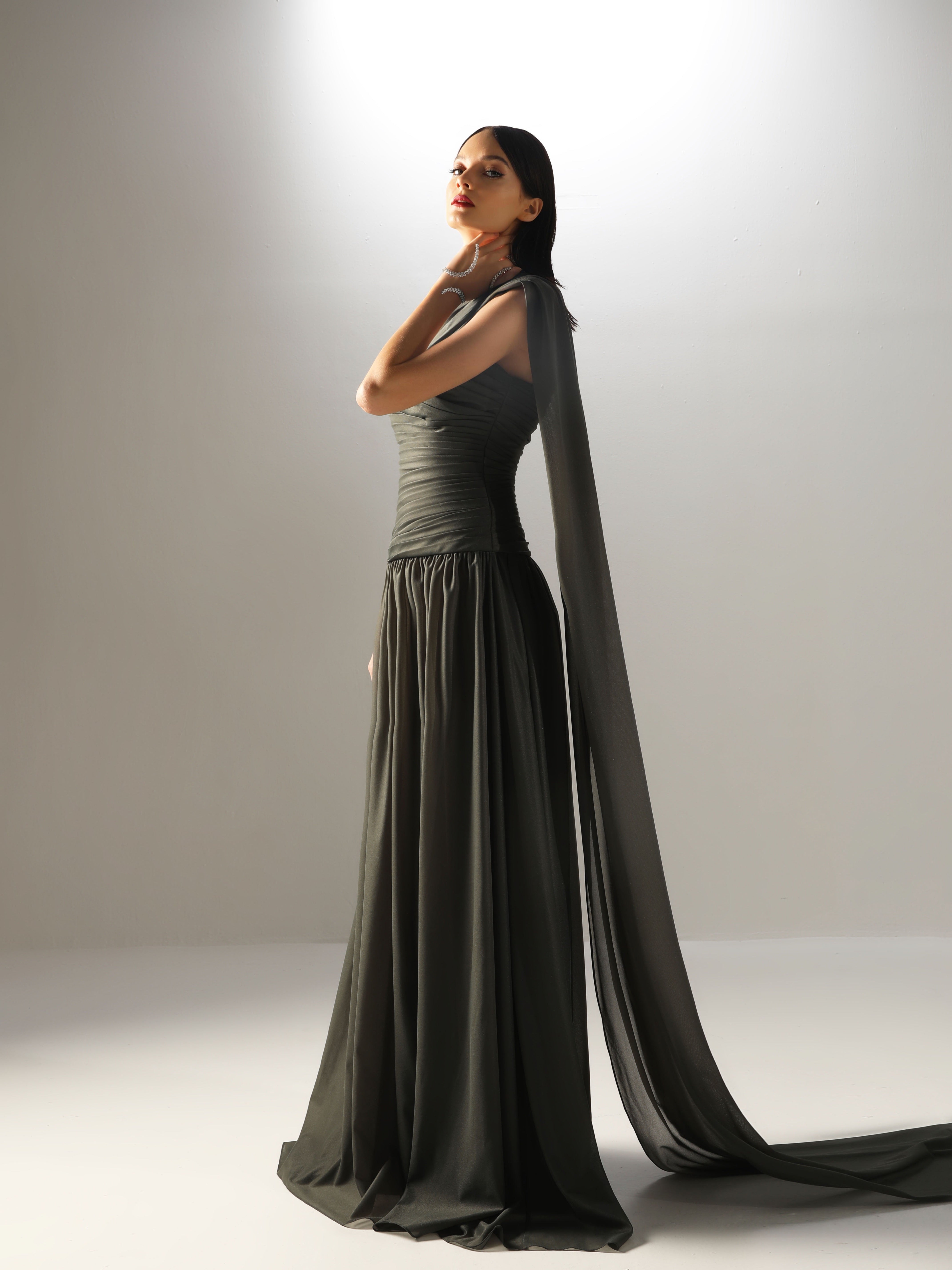 The Velvety Couture Women's OULA Dark Forest Dress is an epitome of elegance, crafted to make a dramatic statement for any evening occasion. This stunning dress features a rich dark forest hue, which adds depth and sophistication to its overall aesthetic, making it a standout piece in any wardrobe. Constructed from unique chiffon, the dress boasts a draped drop waist design that accentuates the figure while offering a graceful flow and movement. The draping technique beautifully elongates the silhouette, creating a flattering effect that enhances the wearer's natural curves and adds a touch of ethereal charm. Adding to the dress's allure is the attached shawl, which provides an additional layer of elegance and versatility. The evening length of the dress ensures that it exudes formal sophistication, making it ideal for galas, weddings, or any upscale gatherings where making a lasting impression is essential. The dress's exquisite craftsmanship and attention to detail reflect Velvety Couture's commitment to luxury fashion. The Women's OULA Dark Forest Dress is a breathtaking choice for those seeking a timeless, elegant look with a modern twist, embodying a sense of romantic allure and refined style that captivates and enchants.