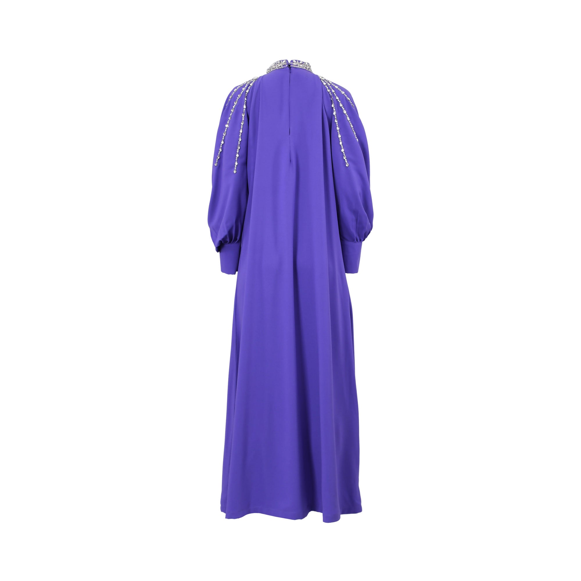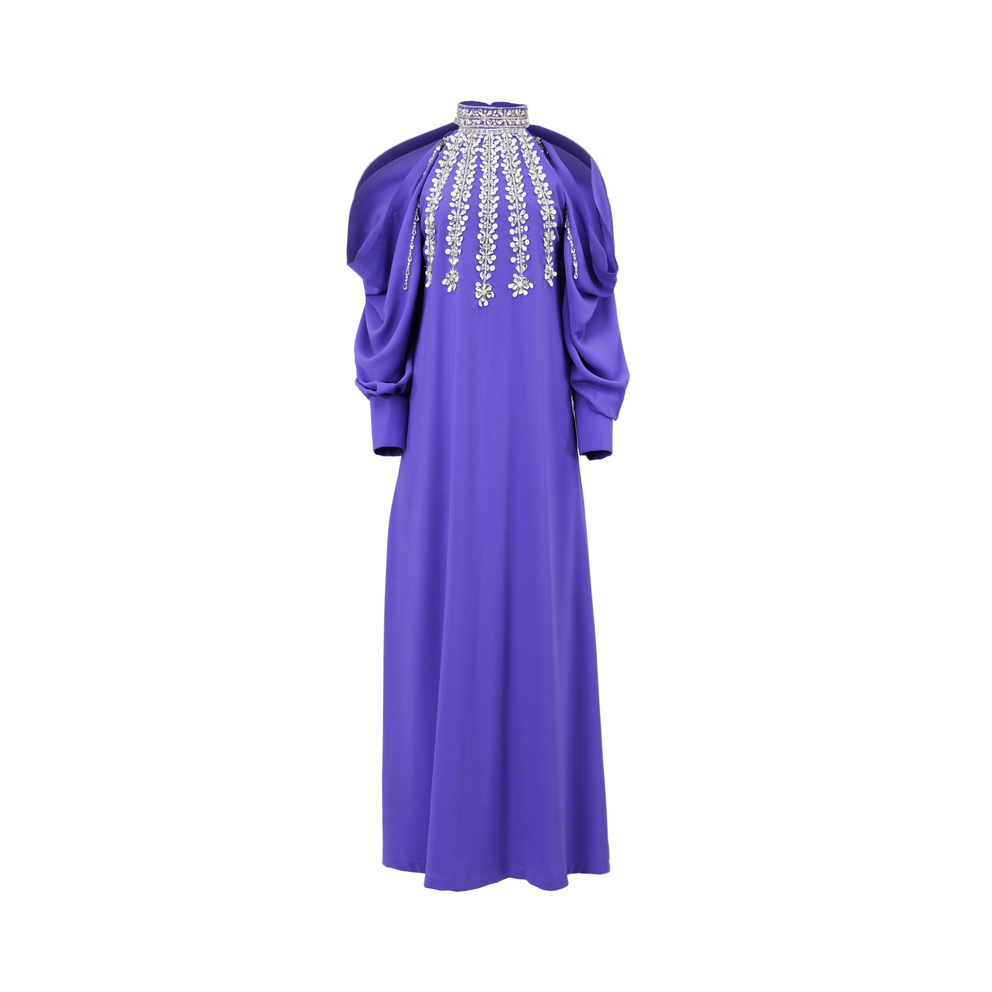 This magnificent full-length piece is presented in a rich, captivating royal purple hue, featuring a graceful, flowing maxi silhouette that drapes exquisitely. The design is distinguished by a sophisticated high mock neck, offering a regal and modest neckline, complemented by elegantly puffed or gathered shoulders that add a dramatic and fashion-forward volume. The sleeves are full-length and tailored, completing the refined profile.