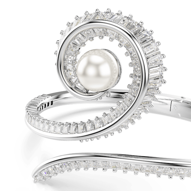 This music-inspired bangle combines elegance with creativity. Taking the abstract form of a treble clef, the rhodium plated design is beautifully spiraled and set with baguette-cut Swarovski Zirconia. For an extra touch of luxury, a single Swarovski Crystal Pearl is then placed at the center. The perfect way to give your style an upbeat and rhythmic infusion.
