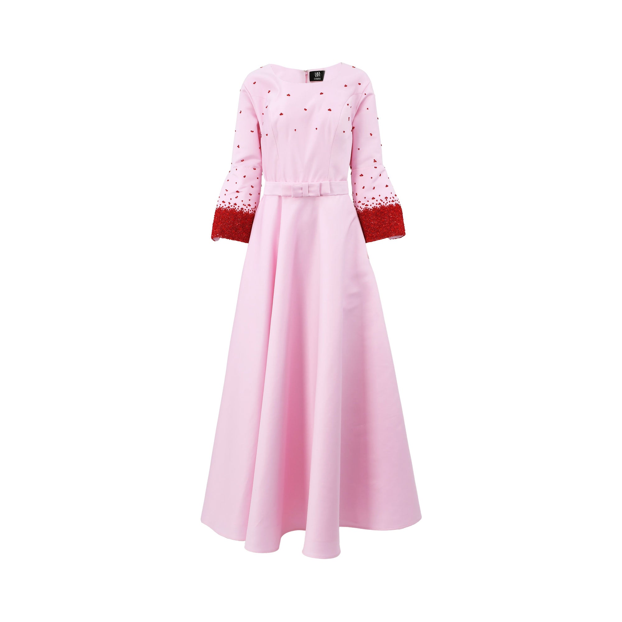 Exude refined elegance in this beautiful pink maxi dress from MAISON DARINE. Crafted in a soft, flowing fabric, this floor-length gown features striking embellished cuffs and delicate detailing, making it a perfect choice for sophisticated evenings and special occasions.