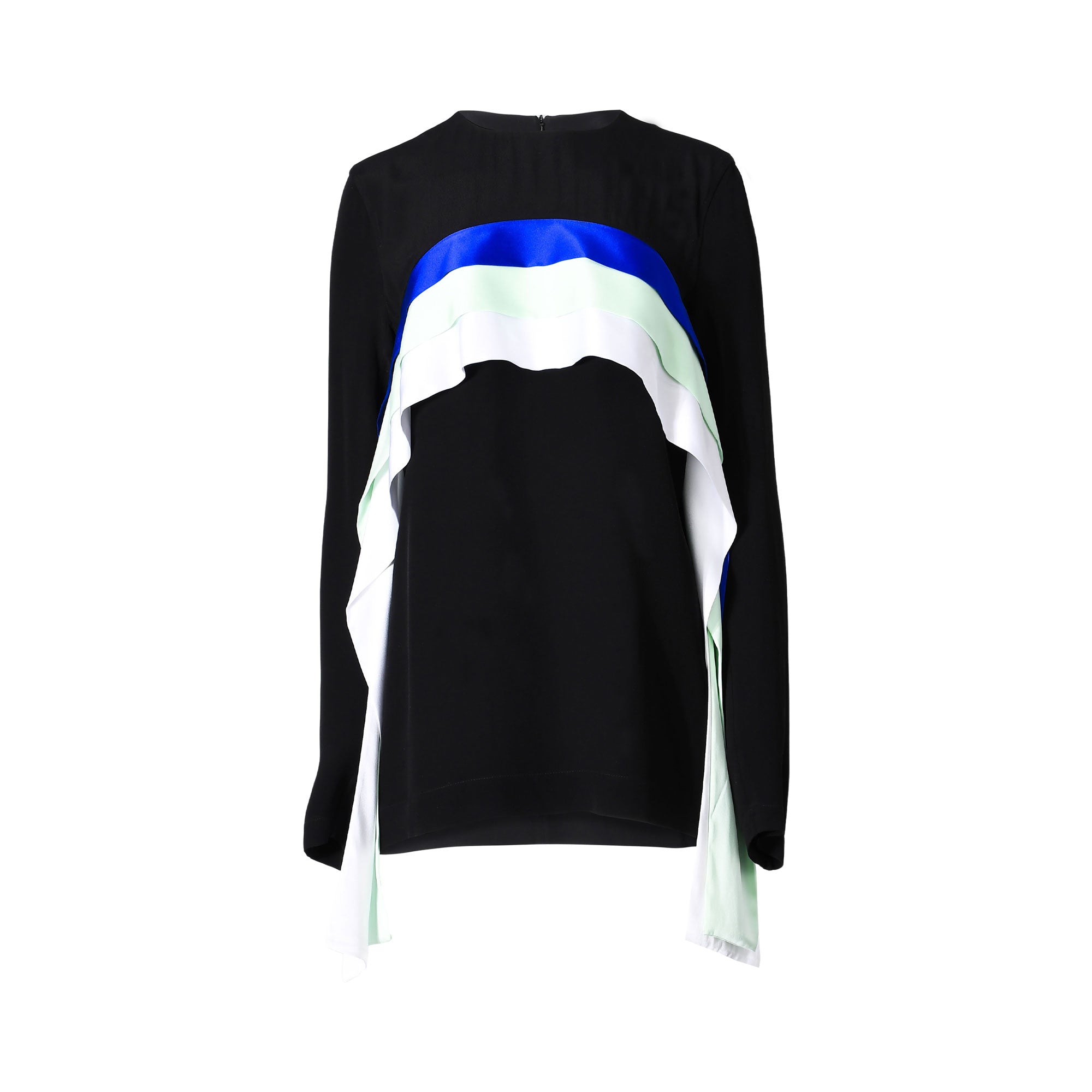 The Baqa Women's Black Blouse is a striking blend of elegance and contemporary design, perfect for making a sophisticated statement. Featuring a classic round neck and long sleeves, this blouse offers a modest yet stylish silhouette that suits various occasions. The concealed zip fastening at the back ensures a seamless, polished look while providing ease of wear. What truly sets this blouse apart are the beautiful multi-color layered details on the front, adding vibrant contrast and artistic flair against the deep black fabric. This eye-catching design element brings a playful yet refined touch, making the Baqa Women's Black Blouse a versatile and fashionable addition to any wardrobe.