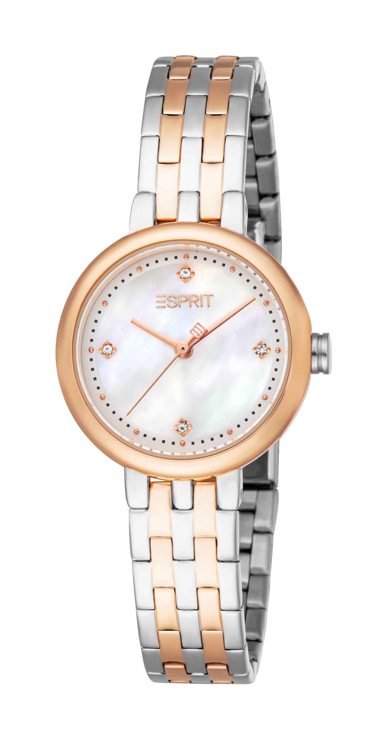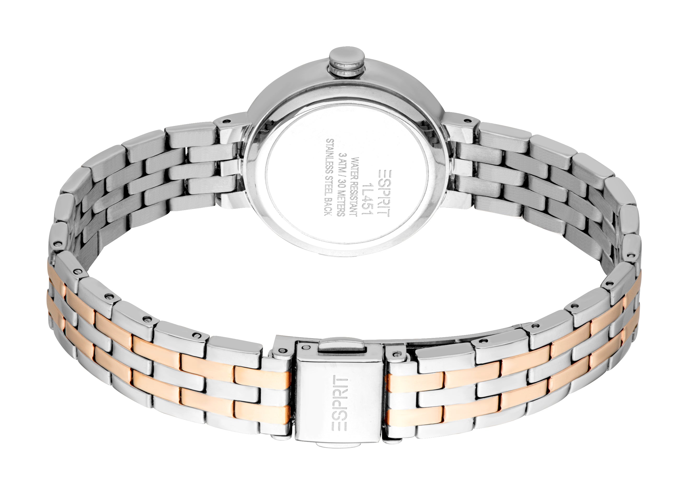 dd a touch of refined elegance to your look with the Esprit Women's ES1L451M0065 watch. This beautiful timepiece features a two-tone (silver and rose gold) stainless steel bracelet and a matching case. The captivating mother-of-pearl dial is adorned with crystal markers and rose gold-tone hands, creating a sophisticated and feminine look. The clean lines and minimalist design make it perfect for both everyday wear and special occasions. Powered by a reliable quartz movement, this watch ensures accurate timekeeping. With a 3ATM water resistance, this Esprit watch is a stylish and versatile addition to any woman's collection.