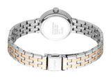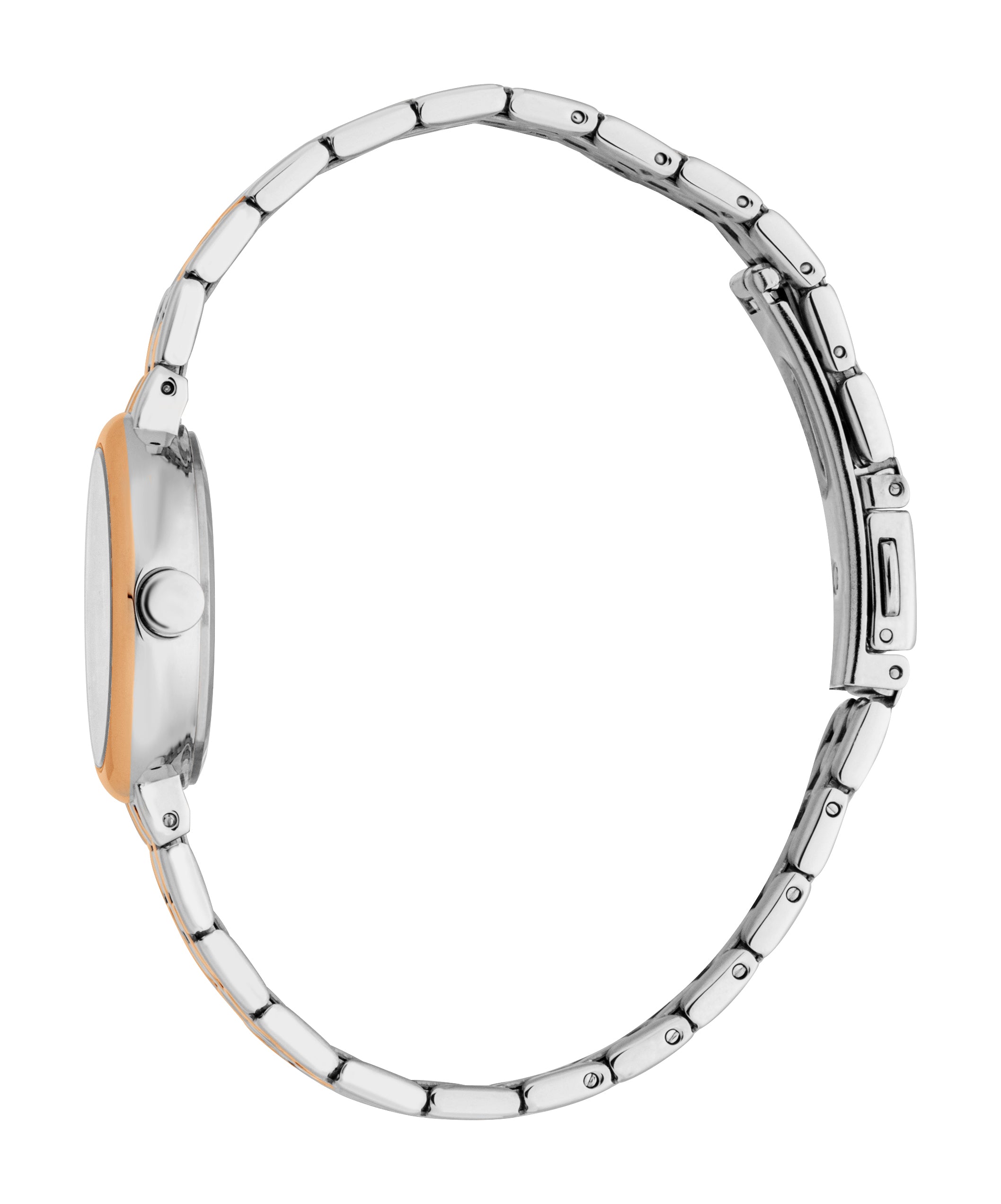 - Bracelet/Strap: Two-tone (silver and rose gold) stainless steel bracelet