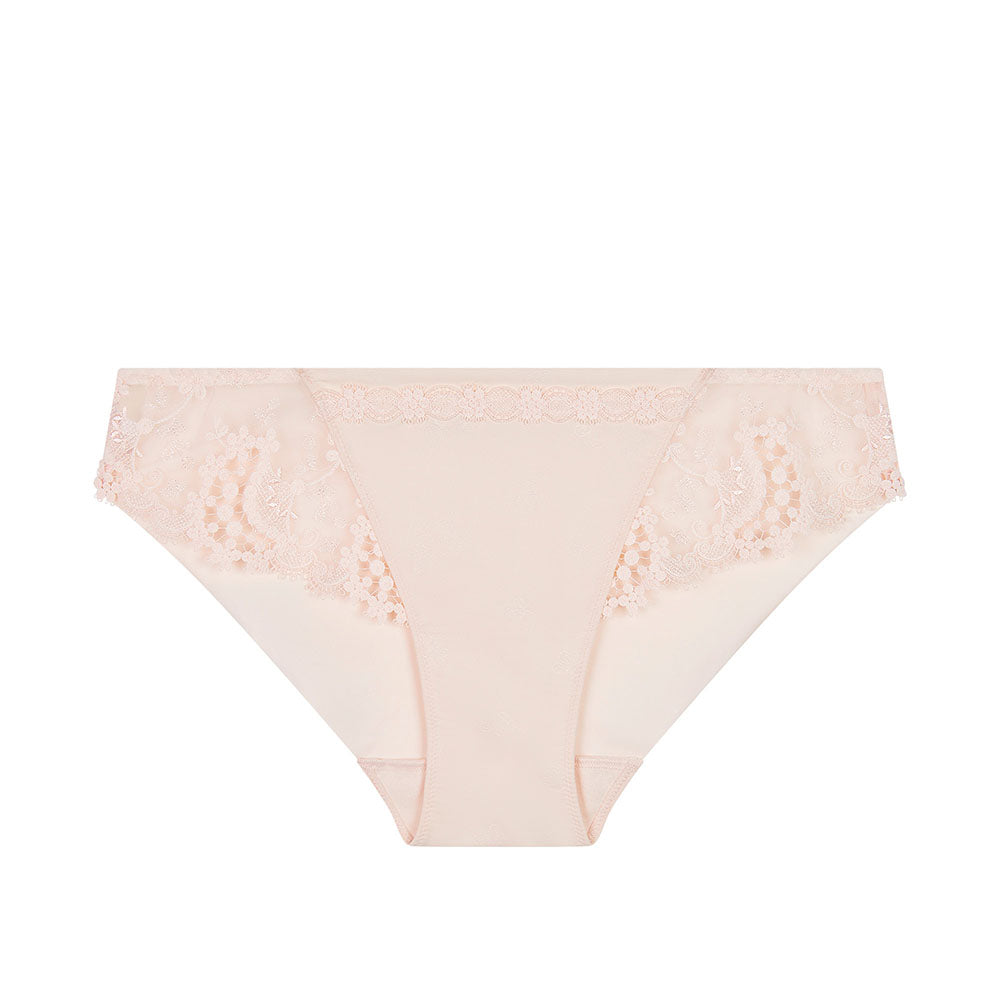 The Simone Perele Wish Slip Brief is a luxury lingerie piece that will make any woman look and feel beautiful. The delicate collection features intricately embroidered floral designs and a feminine guipure lace trim, creating a refined and sophisticated look. The briefs are crafted with an opaque satin in the center front for greater opacity while the back is made from seamless opaque mesh for an invisible look under clothing. The gusset is lined with 100% cotton for comfort and breathability. Every detail has been carefully considered to create a piece of lingerie that is not only stylish but also incredibly comfortable. With its romantic and timeless design, the Simone Perele Wish Slip Brief is the perfect addition to any woman's wardrobe. SPECIFICATIONS: