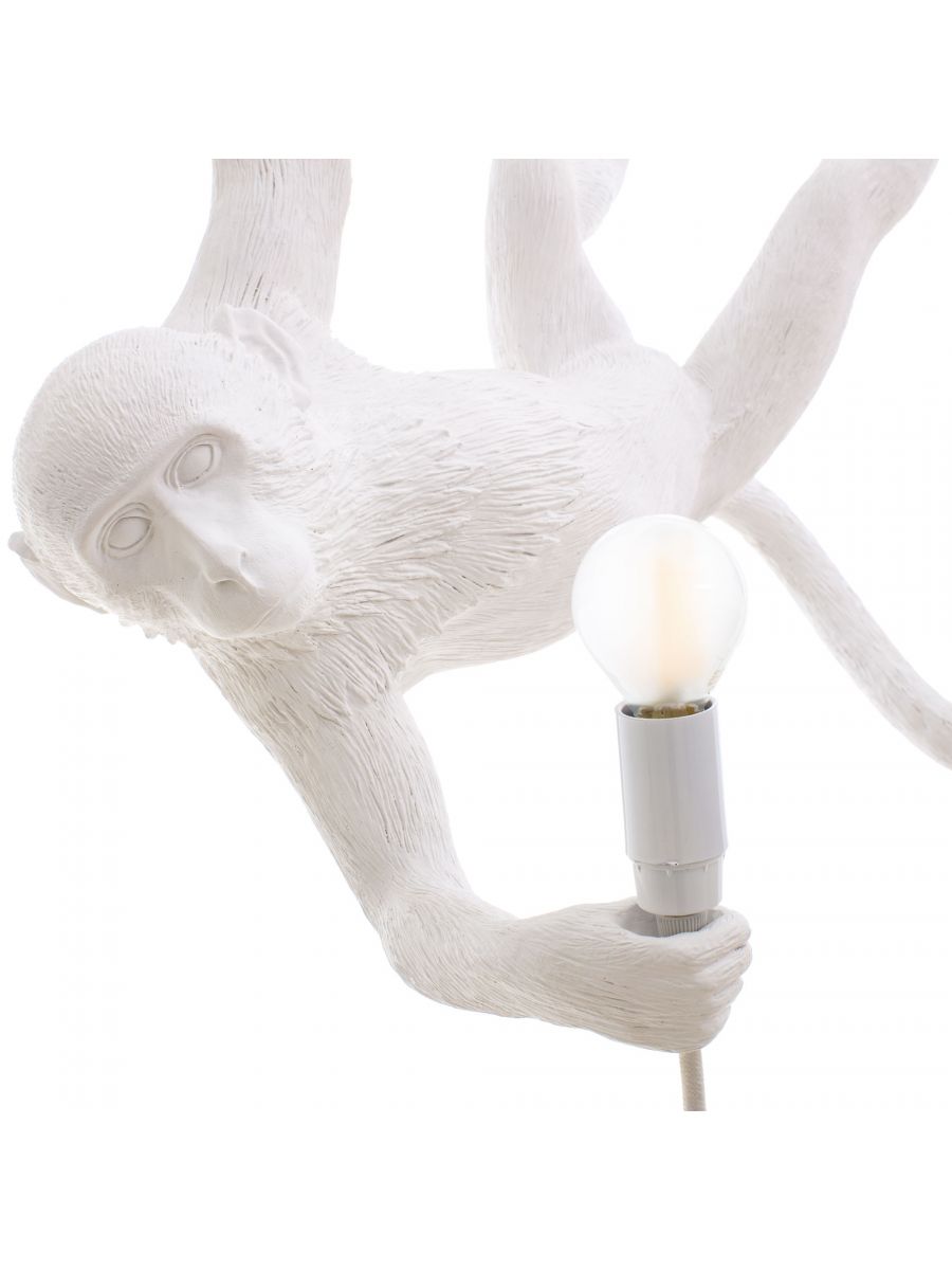 White Seletti The Monkey Lamp Swing Monkey Lamp Swing White (59x40 Cm, h 40) is a fun and cunning monkey lamp with a strong, aesthetic expression. Marcantonio Raimondo Malerba created it by combining the animal kingdom with design to produce an eye-catching lamp. Although this lamp is not intended for outdoor use, the set has been designed so that you can place the inviting monkey by your front door or bring it out back. Aside from lighting up its surroundings, the tiny monkey adds personality and fun. The monkey keeps you company and expresses our desire to live joyful, carefree lives by holding a light bulb in its palm. Perfect for adding a hint of quirk to any living space, this light fixture provides hours of fun and a unique look. SPECIFICATIONS