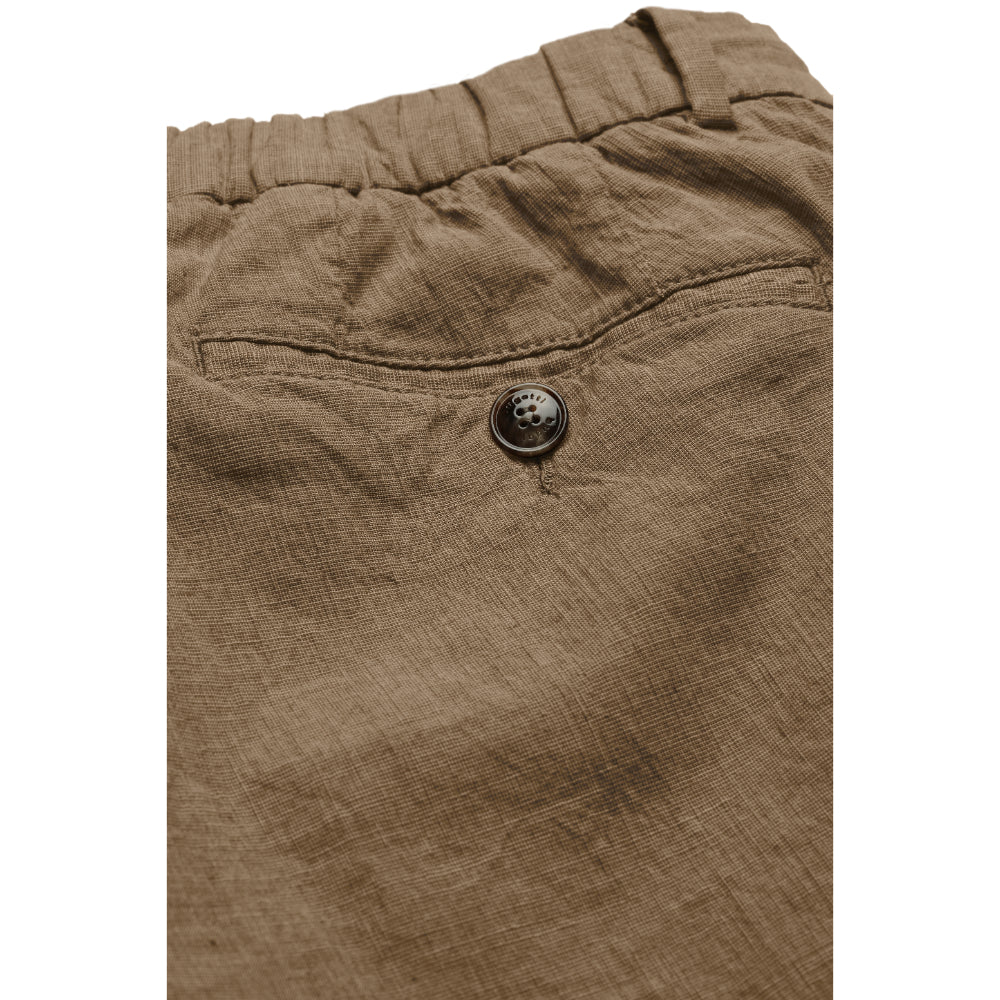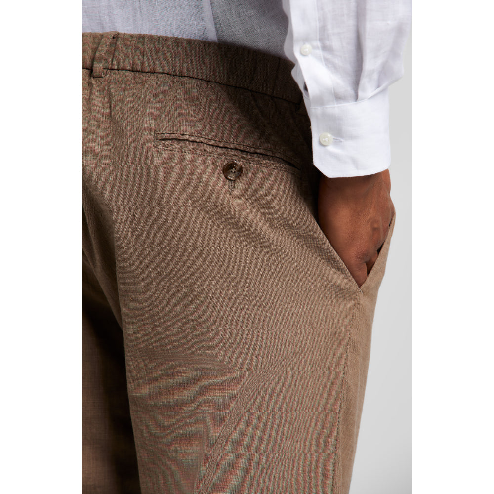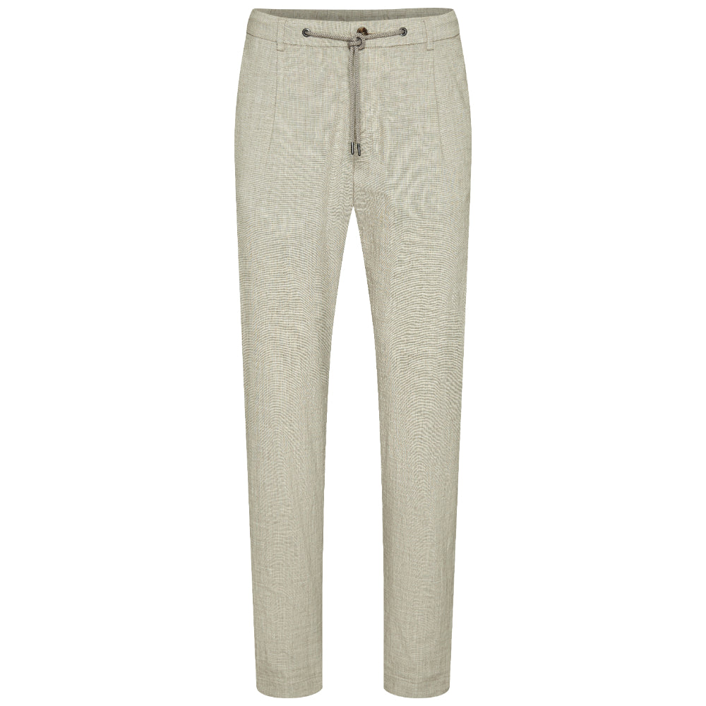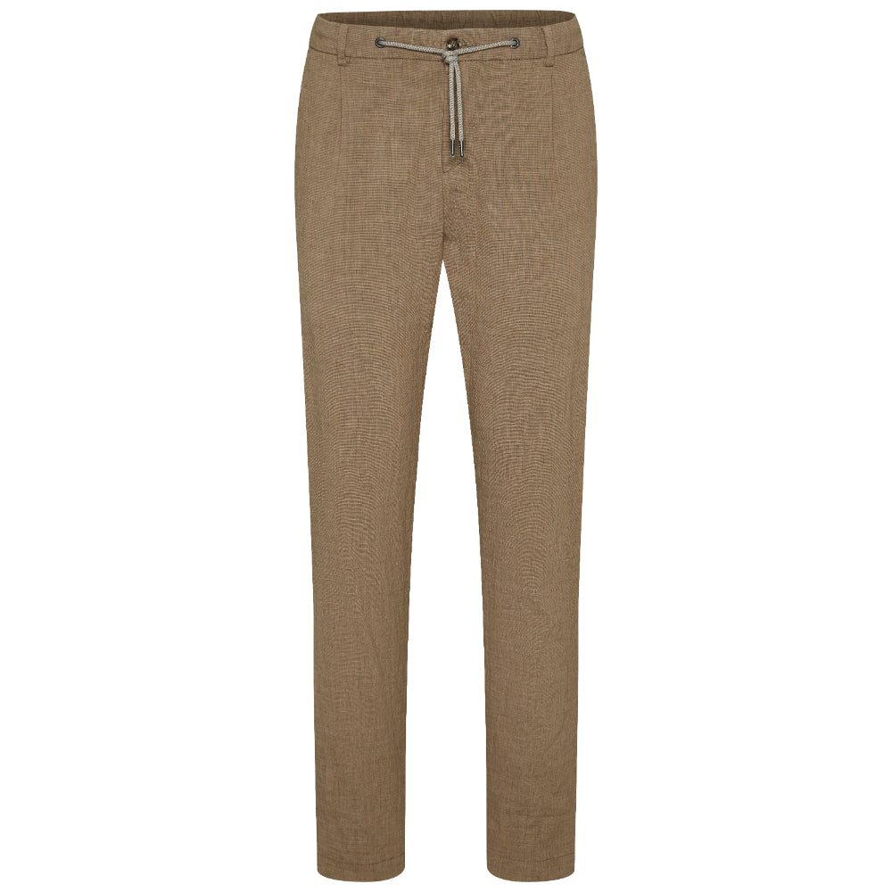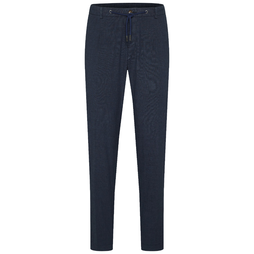 The Bugatti Men's Pleat Front Trousers in a straight cut combine classic style with modern comfort and functionality. Made from a high-quality cotton-linen blend, these trousers offer a soft handfeel and a subtle stretch, ensuring ease of movement throughout the day. Designed with practical belt loops for a secure fit, they feature double piped pockets and elegant French pockets that add both style and convenience. The straight tapered fit with a longer leg length creates a sleek silhouette, perfect for both formal and smart-casual occasions. These trousers perfectly blend timeless elegance with contemporary comfort, making them a versatile addition to any wardrobe.