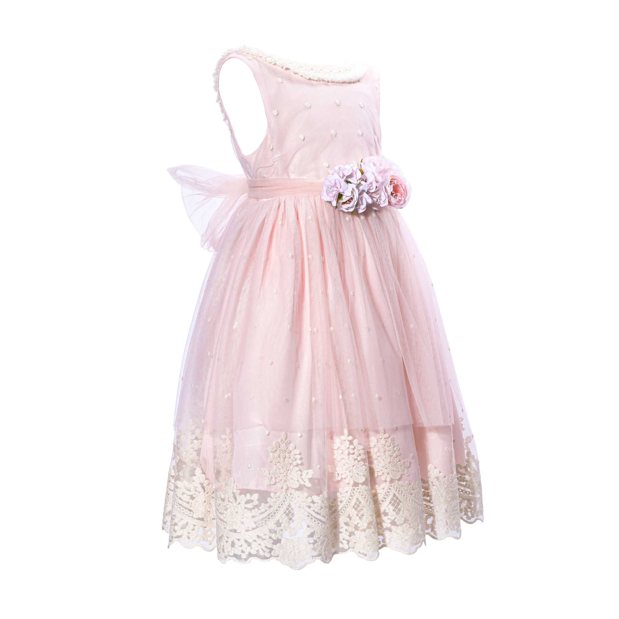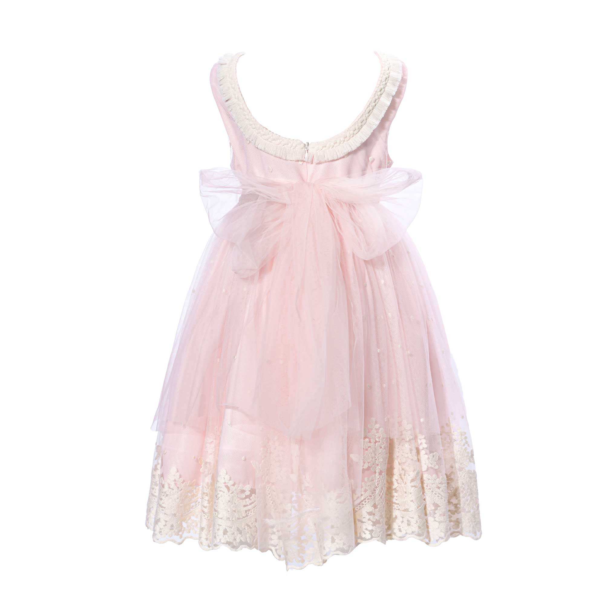 The Primi Eventi Kids Girl's light pink cream dress is a beautiful and elegant dress that is sure to make any young girl feel like a princess. This dress features a round neck and sleeveless design with a lace trimmed neckline and beautiful flowers at the front. The back of the dress is adorned with a large bow and has a concealed back zip closure. The back of the dress also has a deep neckline with a flary, embroidered bottom to add an extra touch of elegance. The dress is also lined, adding to its luxurious look and feel. With its delicate details, this dress is perfect for any special occasion. Whether it's a birthday party or a special family gathering, your little one will be sure to stand out in this beautiful dress. SPECIFICATIONS: