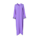 The Laylati Women's Purple Jalabiya is a stunning and stylish traditional garment, perfect for special occasions. The free size design features long, loose sleeves and is crafted from a fine fabric that drapes beautifully. It is cut to a long length and features matching embroidery to the collar and sleeves, as well as a matching pipeline trim. With its delicate details and luxurious fabric, this jalabiya is sure to make you look stunning. Whether you're attending a special event or simply looking to add a touch of elegance to your everyday wardrobe, the Laylati Women's  Purple Jalabiya is a must-have.