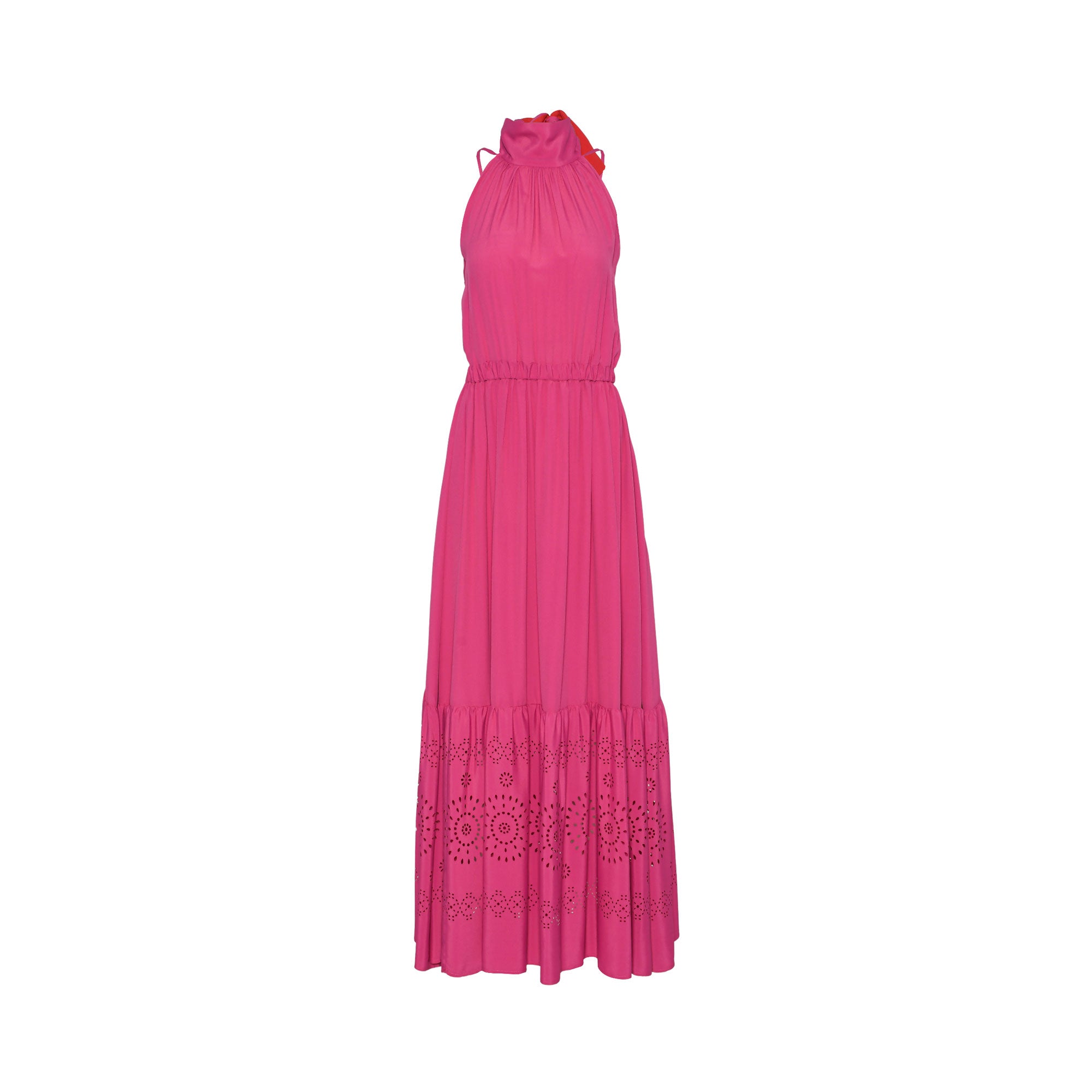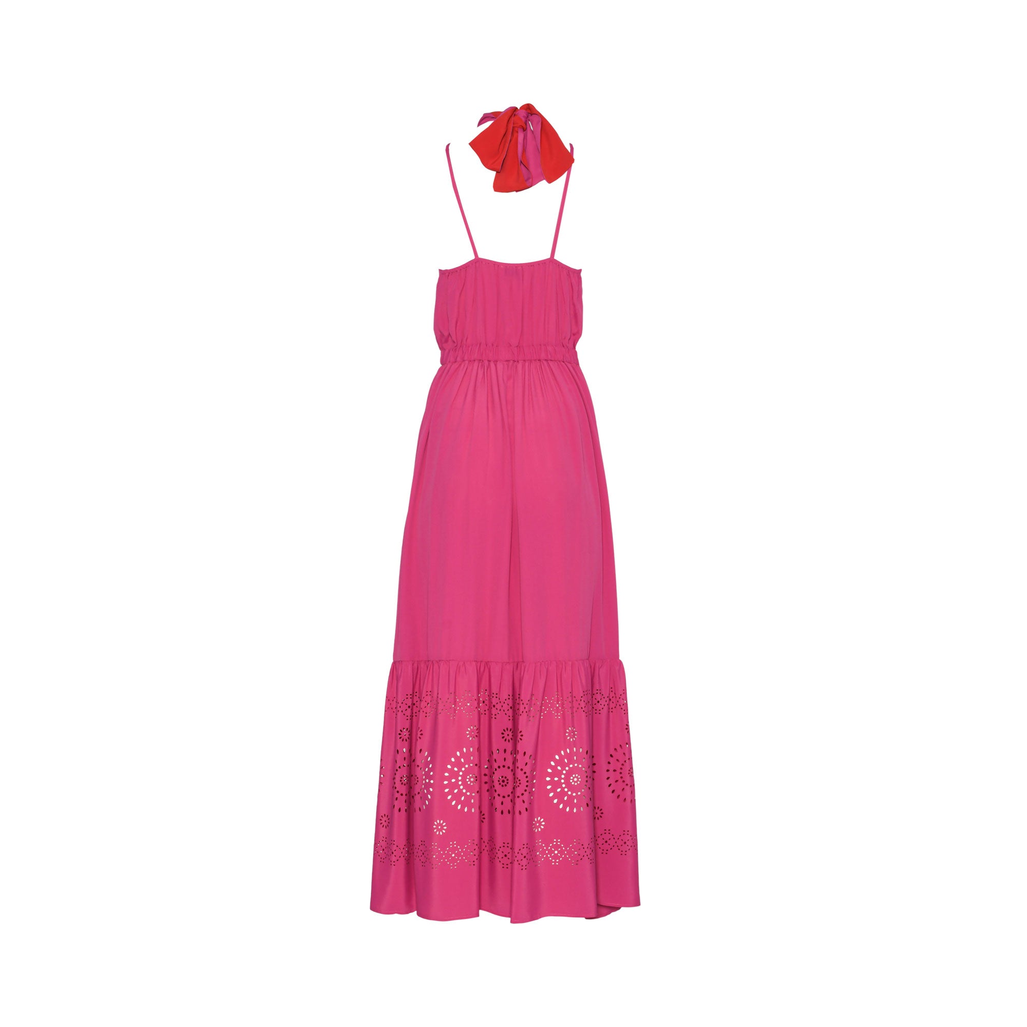 Add a romantic touch to your wardrobe with this beautiful and unique dress from Sfizio. This silky pink lover dress is perfect for dressing up for special occasions or for your everyday look. The halter neckline is embellished with a two-tone neck scarf that adds a touch of elegance to the dress. The waist is marked with a hidden elastic that brings attention to the long skirt that is finished off with a maxi flounce. The laser-cut floral design adds a touch of femininity. The slightly bare back gives an alluring feel to the overall style. Whether you’re looking for something for a wedding, a party, or just something unique to wear around town, this dress is just the right combination of style and sophistication. SPECIFICATIONS