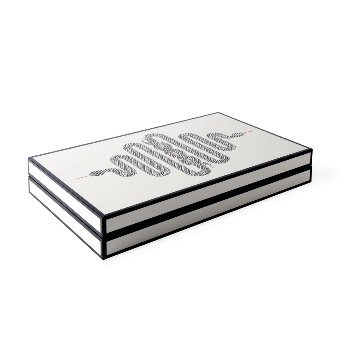 Charm your companions on game night with our Eden Backgammon Set. Crafted in couture lacquer, the high-gloss box features an intricately intertwined duo of slithering serpents. It opens to reveal a striking interior in classic black, ivory, and red, featuring our snakes head-to-head. After vanquishing your foes, fold it closed for a fierce cocktail table accent.