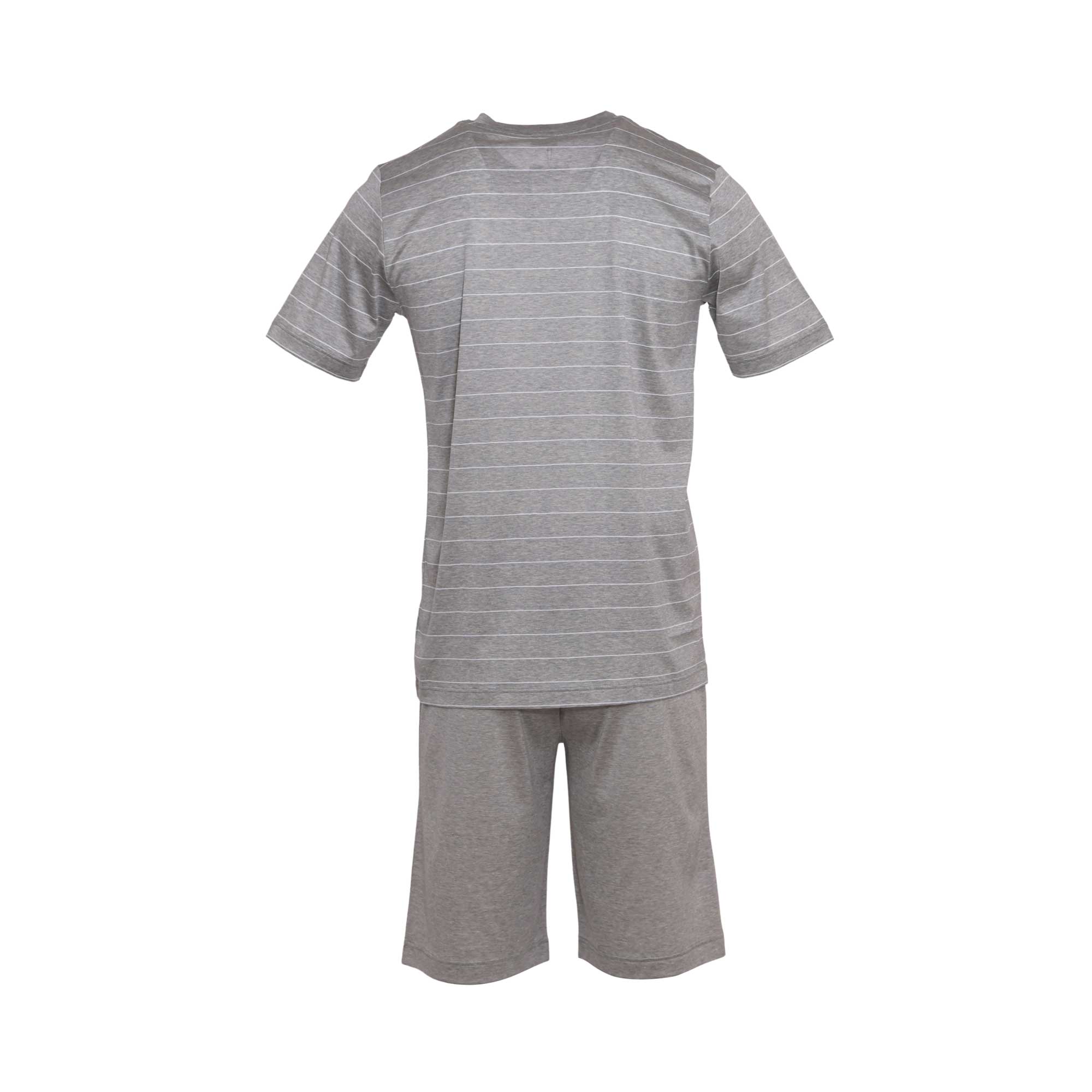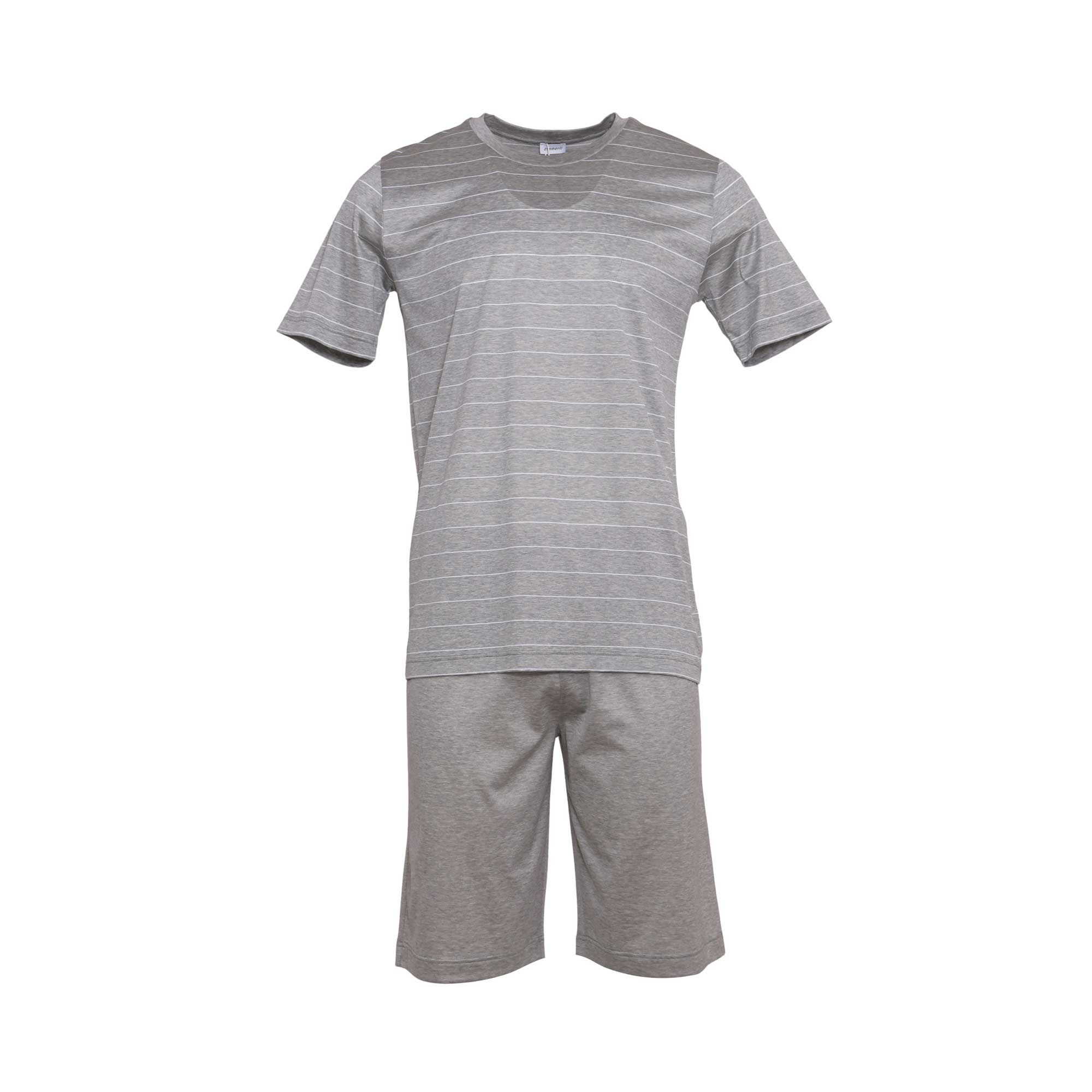 | Zimmerli Men's Light Grey Pyjamas, Noble shine meets wide stripes. The silky sheen of the men's short pyjamas makes an impression. The striped pyjama shirt includes short sleeves and a round collar. The stripes are knitted with great care, with very fine stripes alternating with bigger ones. The hem of the fitting collar is accented with unicolored cloth that matches the pyjama trousers. The short pants have a hidden elastic waistband, a straight cut, and are quite comfortable to wear. Our Filodiscozia Stripes short pyjama for men is composed of 100% cotton. The jacquard fabric bears witness to opulent times; the designs are not printed but sculpted directly into the cloth, ensuring that they remain contrasting and attractive for a long time. SPECIFICATIONS