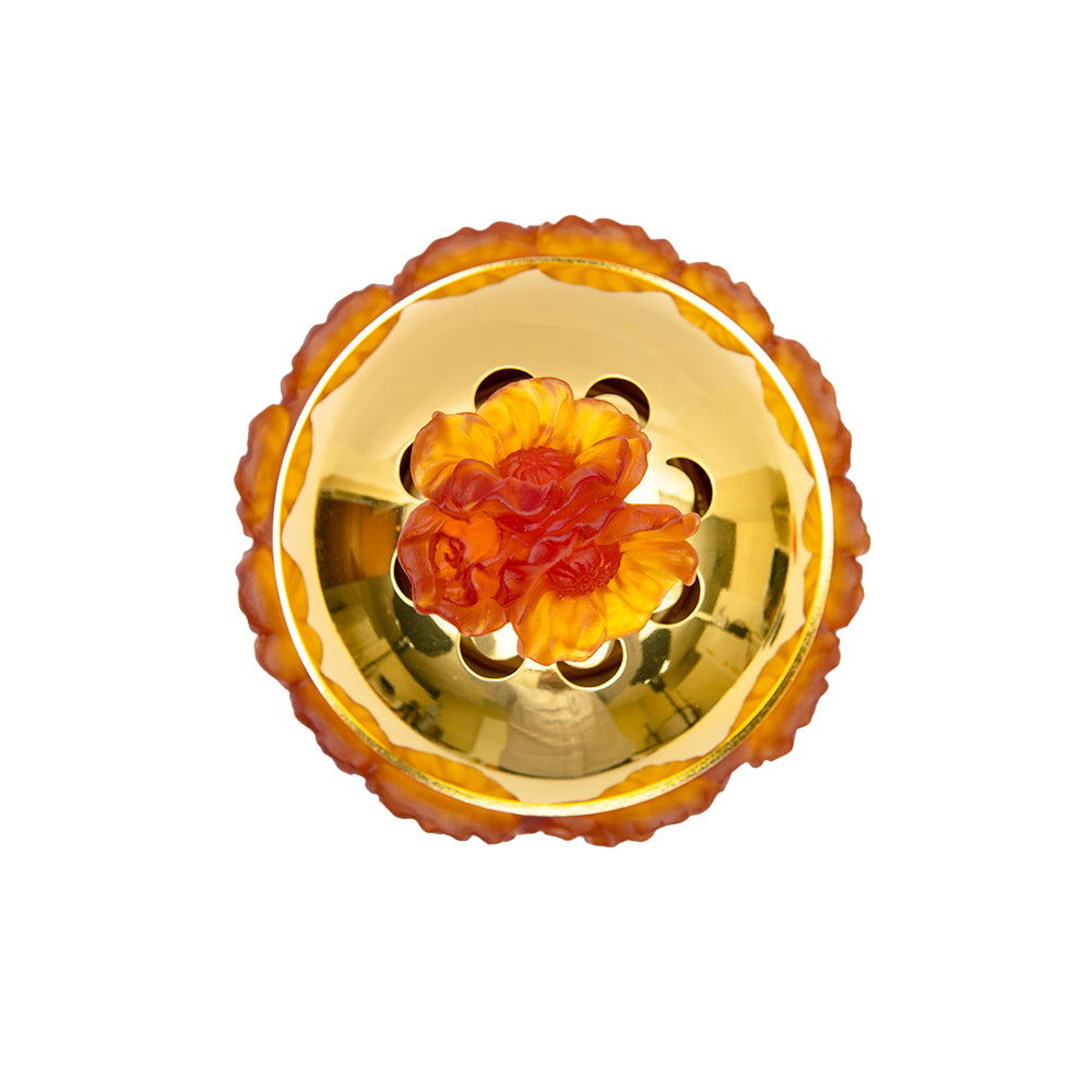 The Cristal de Paris Incense Burner Gold Les Fleurs Amber, H 110x23 Cm is an exquisite creation from the renown French crystal company. The incense burner features a skillfully hand-cut design with intricate shapes, sure to be a conversation starter in any home. This scintillating piece of art stands 110x23 cm tall and is sure to make an impressive decor statement if placed stand-alone. The crystal burner is design, with gold-colored flower motifs set against a neutral amber-blue glass exterior. The flame of the incense is further illuminated by the curves and facets of the burner’s design as the smoke rises from the fragrant scent. Together, the unique shapes and colors create the perfect backdrop for a peaceful, relaxing aroma ritual. The Cristal De Paris Incense Burner Gold Les Fleurs Amber brings simplicity and sophistication together, a wonderful choice that will impress and delight for many years. SPECIFICATIONS