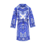 Finished on the perimeter, on wristbands, on pockets, and on one side of the belt with colorful printed cotton satin application; belt closure. It has Paisley pattern cotton terry shawl collar bathrobe.
