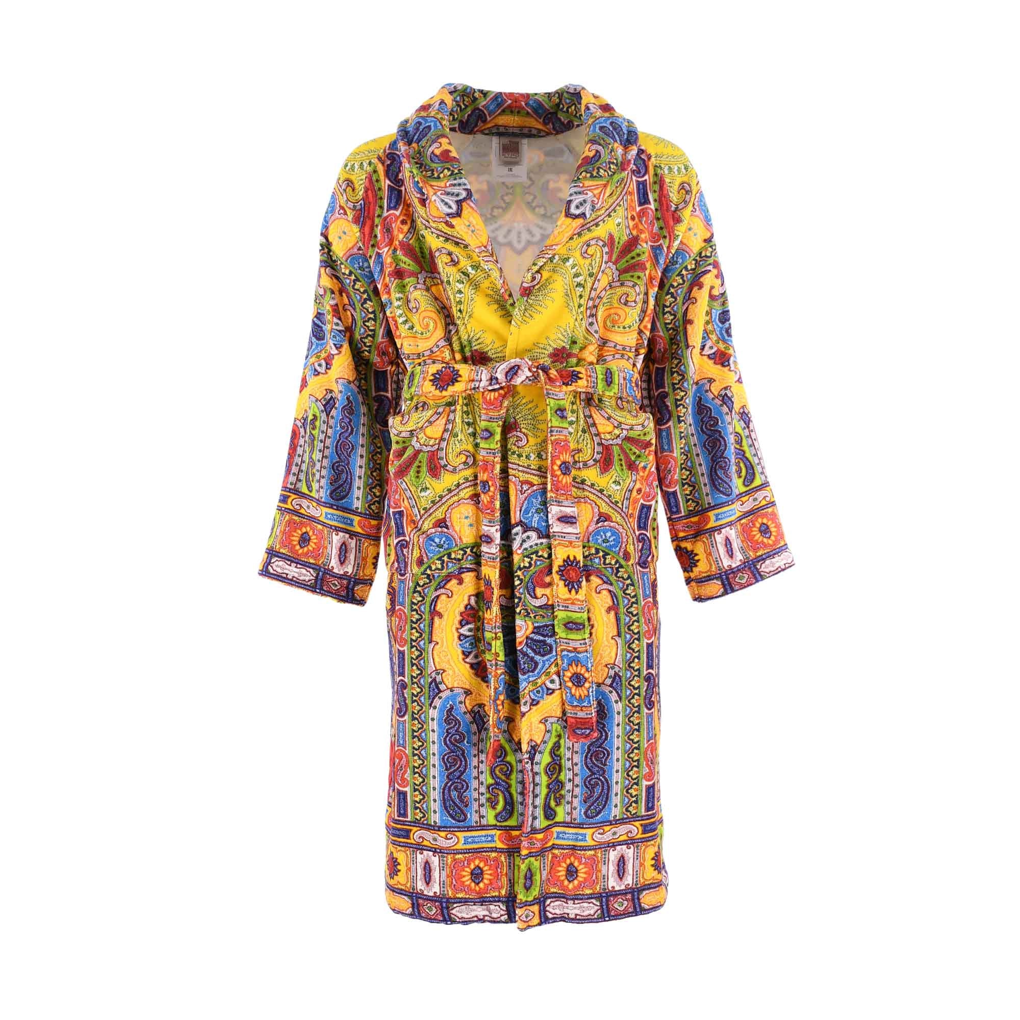 Finished on the perimeter, on wristbands, on pockets, and on one side of the belt with colorful printed cotton satin application; belt closure. It has Paisley pattern cotton terry shawl collar bathrobe.