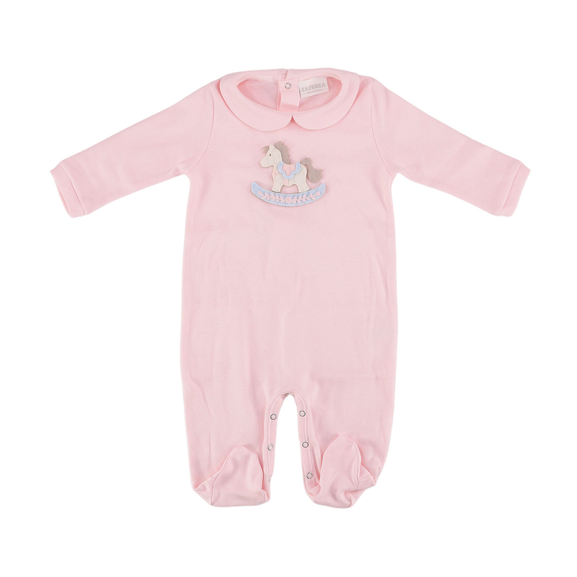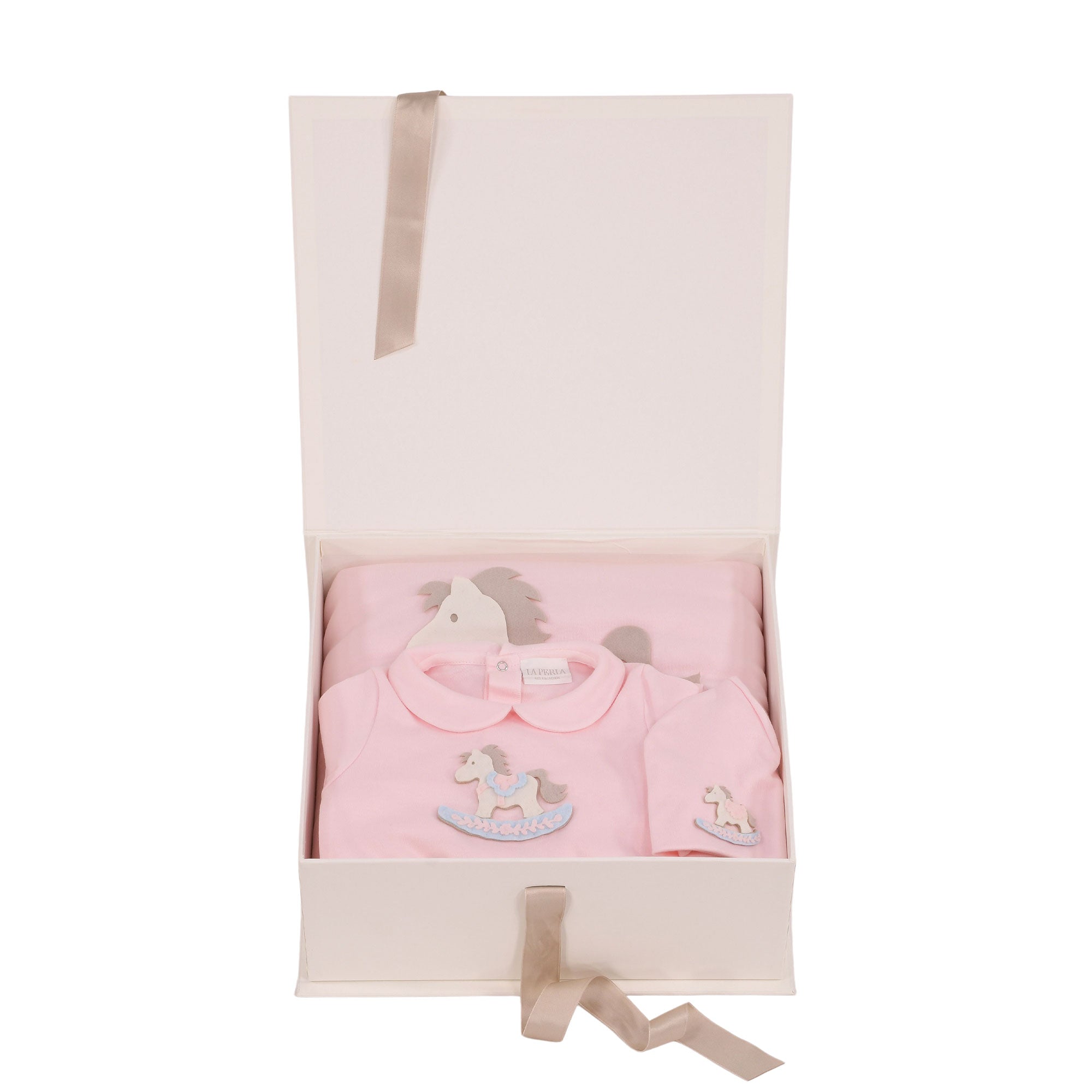 | Baby girl's La Perla collared babygrow, hat and blanket set.The soft and stretchy brushed cotton jersey is adorned with a cute unicorn motif. The soft jersey babygrow has poppers at the back and between the leg for easy diaper changes, and the matching hat is constructed with two layers of jersey for extra warmth and protection from the sun.They come in a beautiful branded box, making them a perfect gift. SPECIFICATIONS :