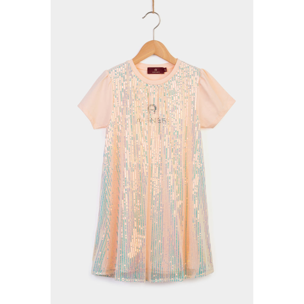 This Sparkly peach cotton dress by AIGNER is the perfect choice for any teen girl. Made with a stretchy jersey fabric, it is comfortable and stylish. The dress is adorned with a tulle overlay that shimmers with sequins, adding a glamorous touch. The dress features puffed sleeves and the brand's large signature 'A' horseshoe logo on the chest. It has a round neck and short sleeves, and it is easy to put on and take off with a simple pull-on design. This dress is sure to be a hit with any teen girl who loves to make a statement with her style. SPECIFICATIONS: