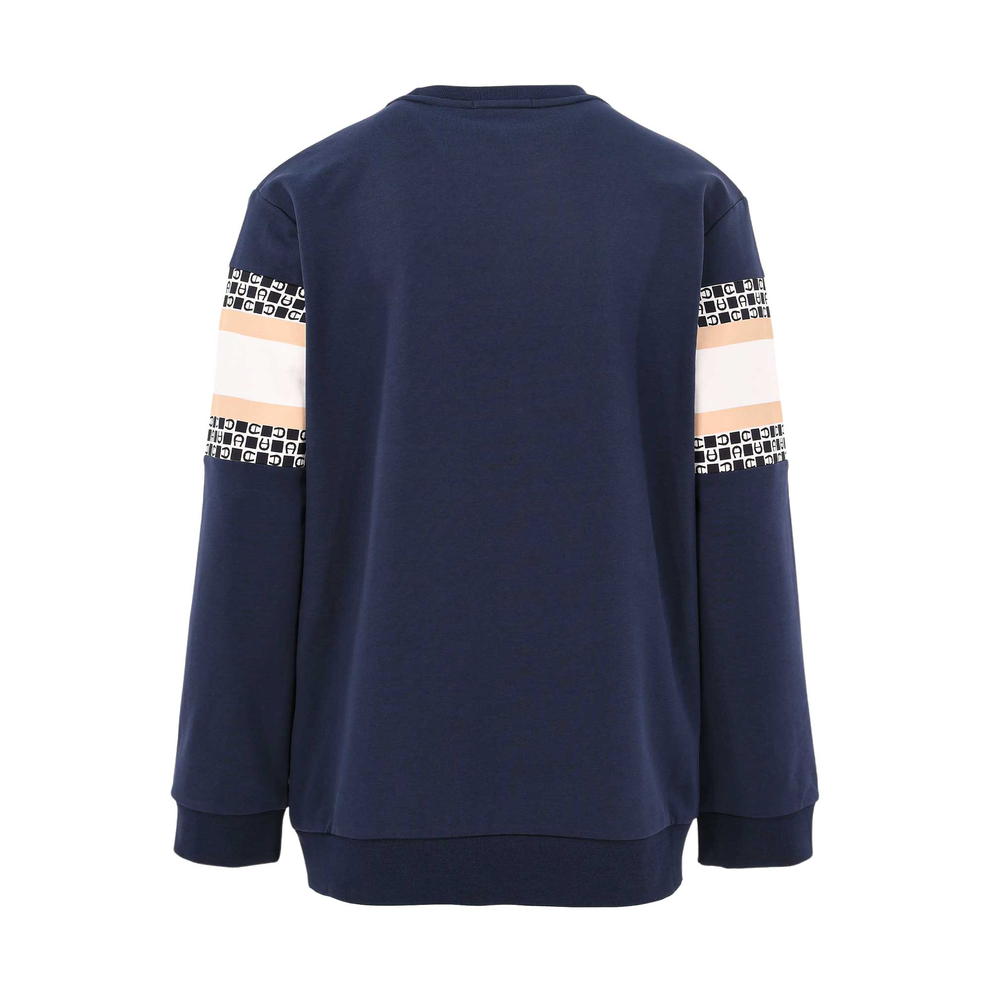 Aigner navy logo Print sweatshirt for boys. Cotton jersey that is soft and stretchy. It has white and beige stripes with black brand name, patterned with black and white brand's signature horseshoe logo print on the front and sleeves. It has a navy and white rubberized horseshoe logo badge on one side hem and ribbed trims.