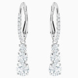 | White, rhodium-plated, round pierced earrings with Swarovski Attract Trilogy crystals This lovely set of pierced earrings was designed with the idea of an everlasting love having a history, a present, and a future in mind. They are really magnificent, and the concept of an everlasting love is a highly romantic one. This sparkling design has a trio of clear crystals that have pavé and rhodium plating applied to them as embellishment. They have an elegance that transcends time and will make a cherished keepsake. There is also a necklace and ring that go together perfectly. SPECIFICATIONS