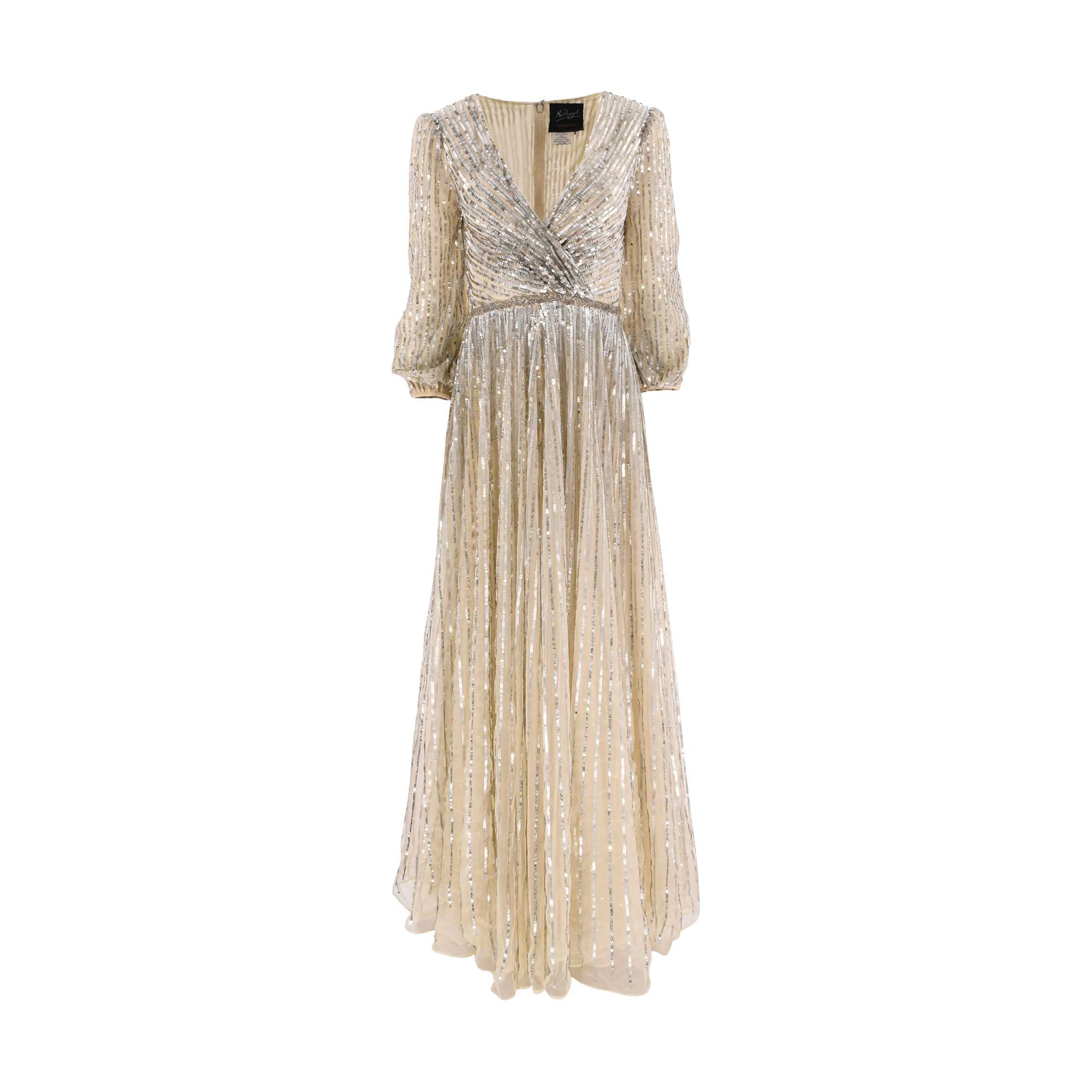 Mac Duggal is a pioneer in the world of women's fashion thanks to his innovative combination of the intricate hand-beading techniques of his native India with his own refined sense of design. After starting out with just ten dresses in 1984, Mac Duggal has become one of the most coveted labels in women's high-end apparel and evening wear thanks to its reputation for designing clothes that look great on women of all ages, sizes, and body types. Make a statement in Mac Duggal's new-season gown's glistening layers. Glossy sequins and glass beads carefully placed on the lightweight tulle fabric illuminate the design's balloon-sleeved wrap bodice and long skirt. Enhance the glitz of this sparkling ensemble with diamond drop earrings and sculpted sky-high heels.