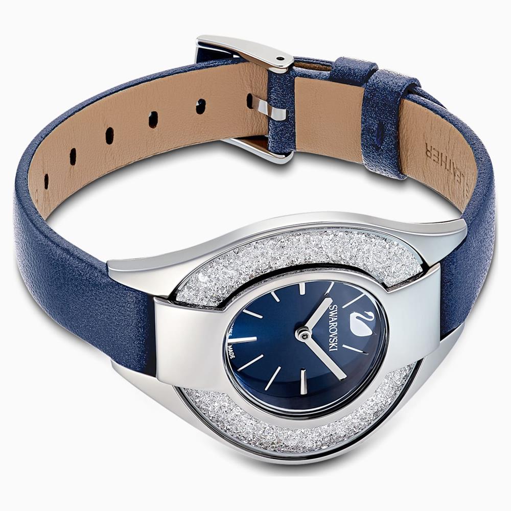 Modern, striking, sporty: This watch by Swarovski impresses with its cool and powerful design. Its case is filled with approximately 1,500 clear crystals through the Crystalline technique, adding a brilliant array of sparkles. The blue sunray dial complements the stainless steel case and silver-tone index markers perfectly, with a blue genuine leather strap completing the design. This Swiss Made watch adds a dynamic and powerful touch to many different looks.