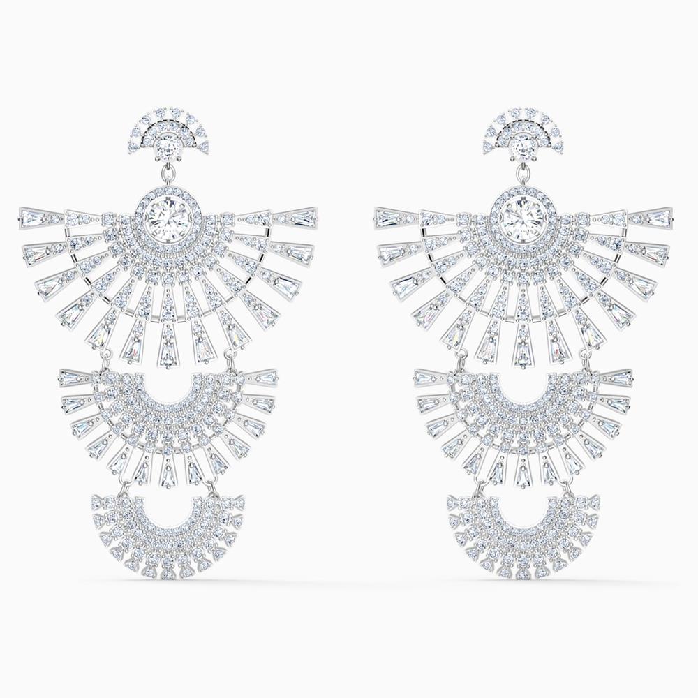 This ravishing pair of pierced earrings by Swarovski is a striking example of expert craftsmanship and faceted brilliance. Each of these marvelous earrings displays numerous sparkling white stones and clear crystals in three fan-shaped arrangements, one featuring a gleaming white dancing stone in its center. Dangling from a fourth, smaller glittering fan shape, this pair of earrings reflects incoming light brilliantly into a spectacular display of sparkles. Wear this talking piece with the matching necklace and bracelet and you are certain of a grand entrance at special occasions.