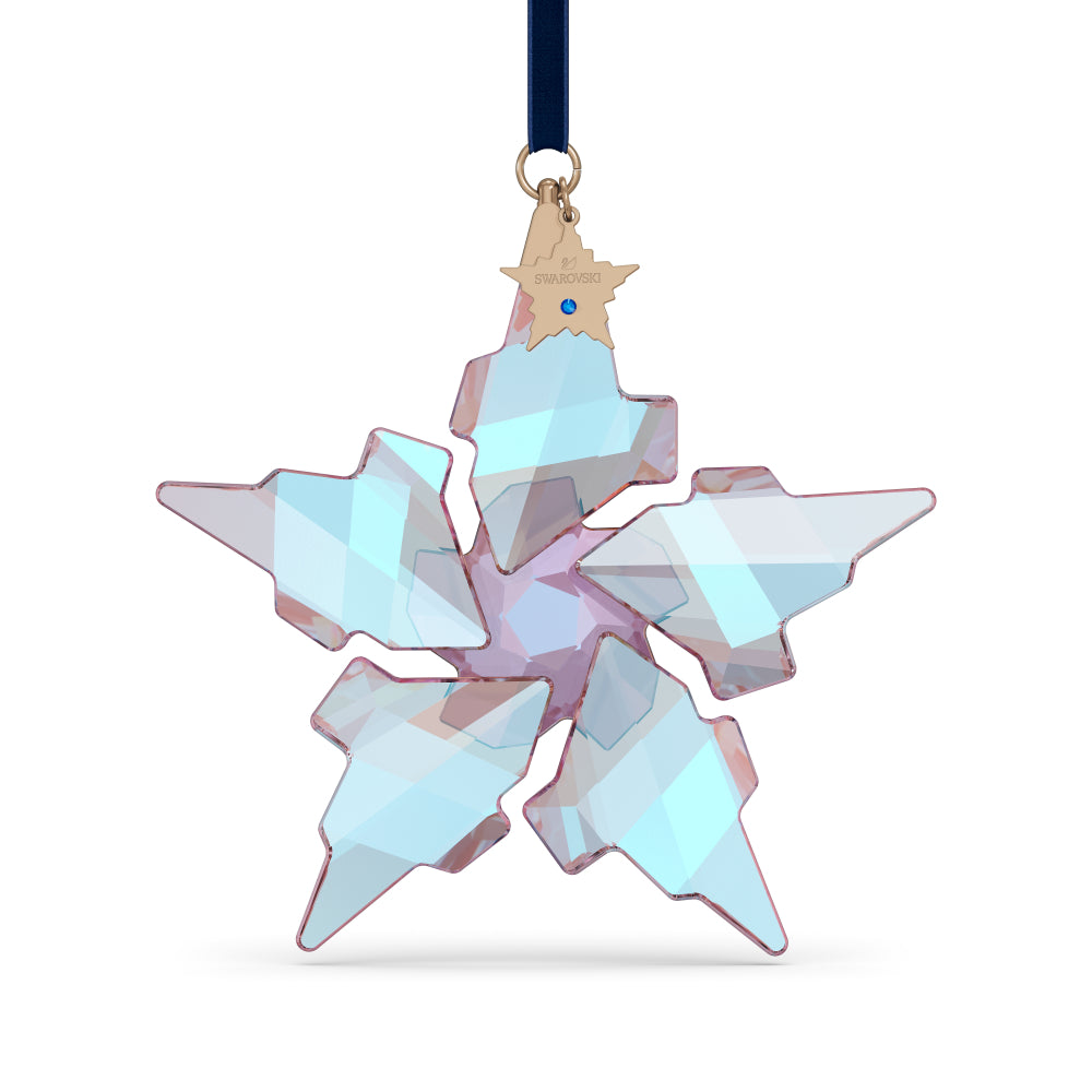 | Swarovski 30th Anniversary Ornament, Annual Edition 2021, This exquisitely made star design, which will be available only in 2021, commemorates the 30th anniversary of Swarovski's Annual Edition Ornament. Elegant clear crystal has been carefully cut in a unique new asymmetric form with a Blue Aurora Borealis look. Michele Blasilli designed the star, which has 67 facets and hangs on a blue velvet ribbon. The gold tone plated metal tag in the shape of a star is decorated with a small crystal and etched with the Swarovski emblem on the front and '2021' on the back. Hang on a decorated tree, in a window, or on one of our Christmas Ornament Home Displays. Object used for decoration. This is not a toy. Children under the age of 15 are not permitted. SPECIFICATIONS