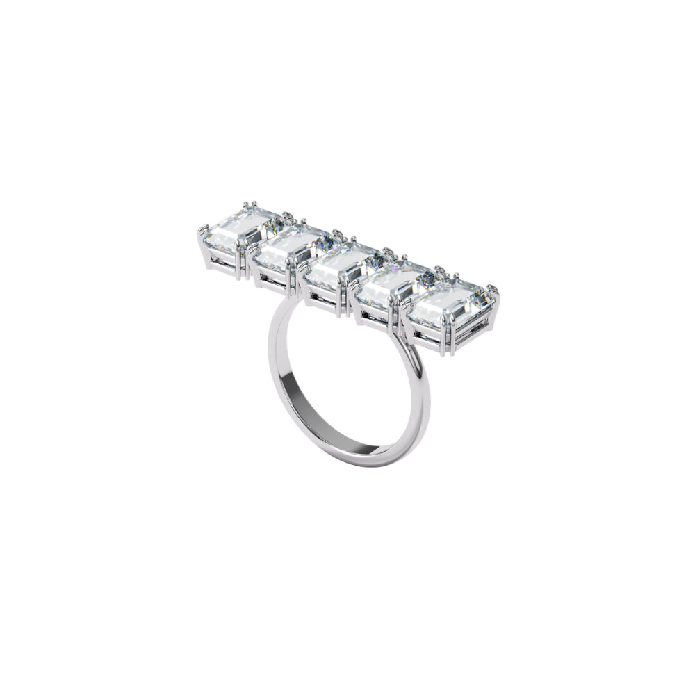 With its clean lines and perfect equilibrium, this geometric ring is a feat of modern minimalism. Showcasing octagon cut clear crystals in a line of rhodium plated claw settings, it can be styled with anything and everything, day or night. This ring is part of the Millenia family, designed by Creative Director Giovanna Engelbert for Collection I.